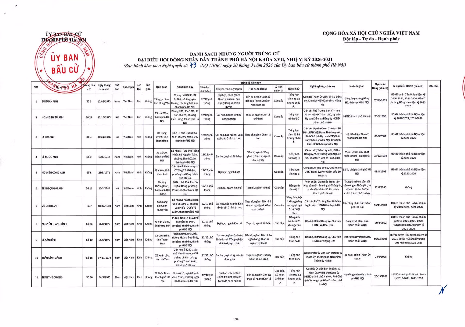Ngày 20/3, Uỷ ban bầu cử thành phố Hà Nội ban hành Nghị quyết số 79/NQ-UBBC về việc công bố kết quả bầu cử và danh sách những người trúng cử đại biểu HĐND Thành phố khoá XVII, nhiệm kỳ 2026-2031.