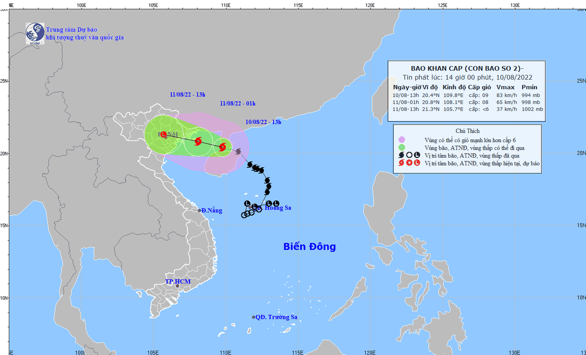 Theo thông tin mới nhất từ cơ quan khí tượng, lúc 13h ngày 10/8, vị trí tâm bão ở vào khoảng 20,4 độ Vĩ Bắc; 109,8 độ Kinh Đông, trên khu vực phía Bắc đảo Hải Nam (Trung Quốc), cách đảo Bạch Long Vĩ khoảng 220 km về phía Đông, cách Quảng Ninh khoảng 250 km về phía Đông Nam, cách Nam Định 360 km về phía Đông. Sức gió mạnh nhất vùng gần tâm bão mạnh cấp 8 - 9 (62 - 88 km/giờ), giật cấp 11. Bán kính gió mạnh cấp 6, giật cấp 8 khoảng 130 km tính từ tâm bão.