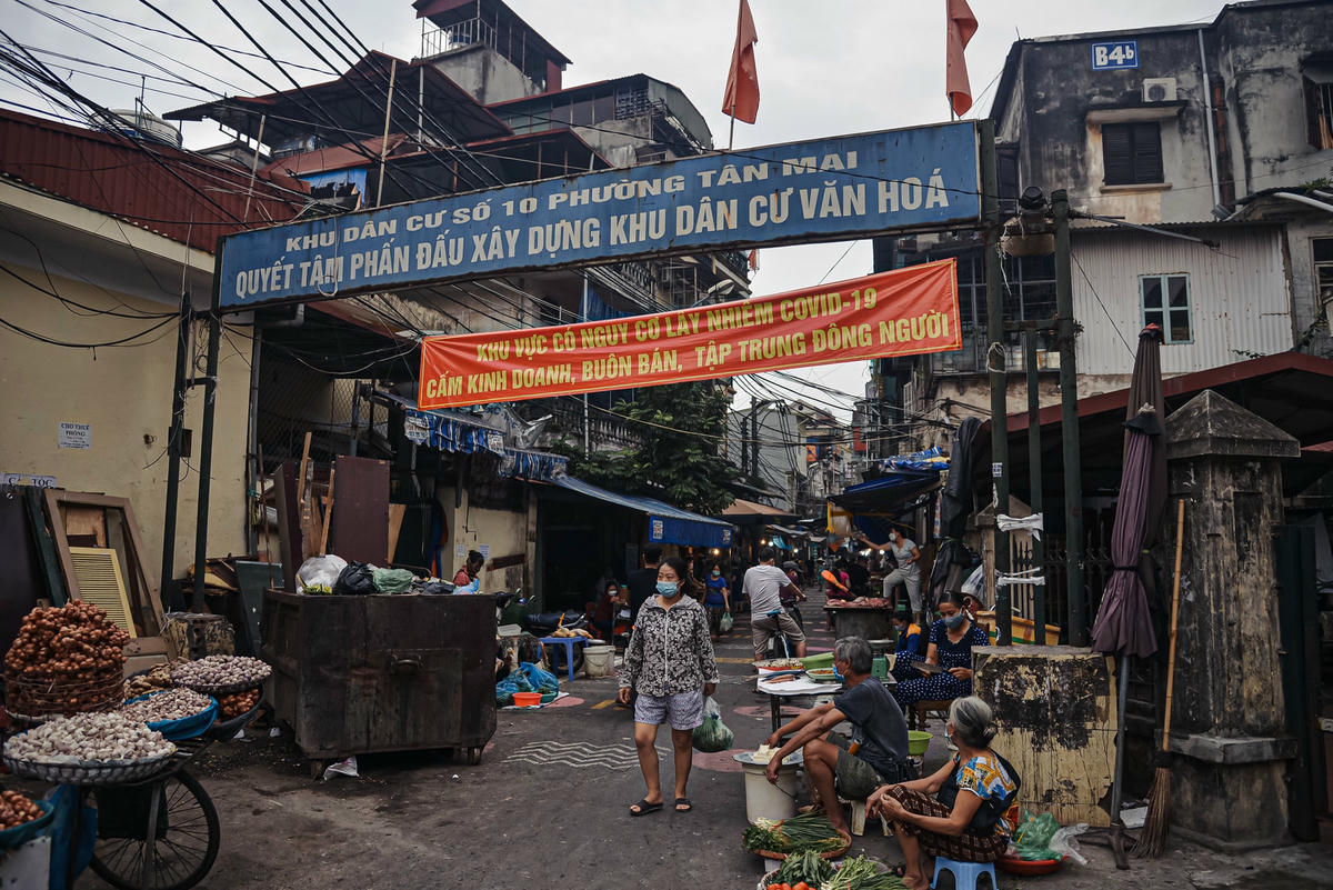 Con đường dẫn vào chợ Tân Mai được lực lượng chức năng vẽ ô, kẻ vạch phân luồng từ xa, hạn chế người dân tập trung đông người nhằm đảm bảo công tác phòng chống dịch Covid- 19.