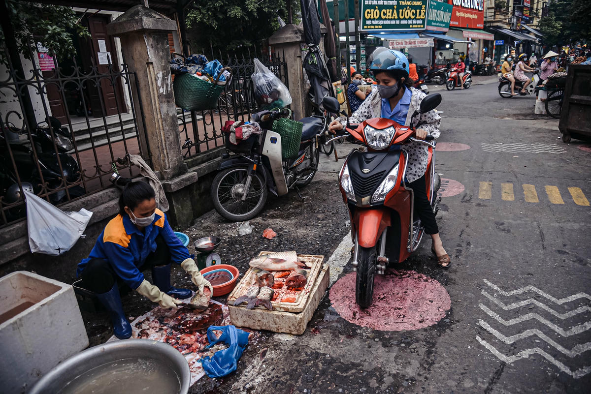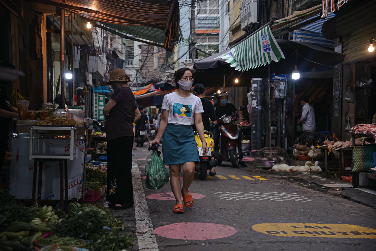 Trong thời thực hiện giãn cách xã hội, lực lượng chức năng đã vẽ ô, kẻ vạch cho chợ Tân Mai (quận Hoàng Mai, Hà Nội) nhằm phân luồng tại con đường dẫn vào chợ.Lối vào chợ tại khu dân cư số 10 phường Tân Mai thường tấp lập "người mua kẻ bán". Trước tình trạng đó, việc kẻ vạch phân luồng tại chợ là một sáng kiến hay giúp hướng dẫn người dân đi chợ nhưng vẫn đảm bảo công tác phòng chống dịch Covid- 19.Trước mỗi quầy bán hàng ở chợ đều được vẽ các ô hình tròn màu hồng dành cho người dân tới để mua hàng.Các gian hàng bày bán đều phải xếp phía sau đường kẻ màu trắng, nếu gian hàng nào bày bán ngoài kẻ vạch đều bị nhắc nhở.Hầu hết, người dân đi chợ đều có tinh thần tự giác phòng chống dịch Covid- 19.Mỗi ô sẽ được vẽ theo hình thù, màu sắc khác nhau để người dân dễ dàng phân biệt.Mỗi vị trí dừng lại được đánh dấu trên hình tròn màu hồng, khoảng cách mỗi vòng cách nhau khoảng 2 m.Theo chia sẻ của một số tiểu thương, đoạn đường này được hoàn thành cách đây khoảng 3 - 4 ngày.Anh Hùng, người bán rau tại chợ Tân Mai cho hay, việc vẽ ô, kẻ vạch phân làn giúp người dân không chen chúc mua hàng, thay vào đó người dân sẽ chờ từng người vào mua rồi đi ra. Mỗi người đứng cách xa nhau 2 m khi mua hàng cũng giúp tôi cũng yên tâm hơn trong việc buôn bán.Chị Hương người mua hàng tại chợ cho biết: “Việc bố trí khoảng cách giũa người mua và người bán giúp tôi đứng giãn cách trong khi mua hàng hóa, từ đó đảm bảo được công tác phòng chống dịch bệnh”.