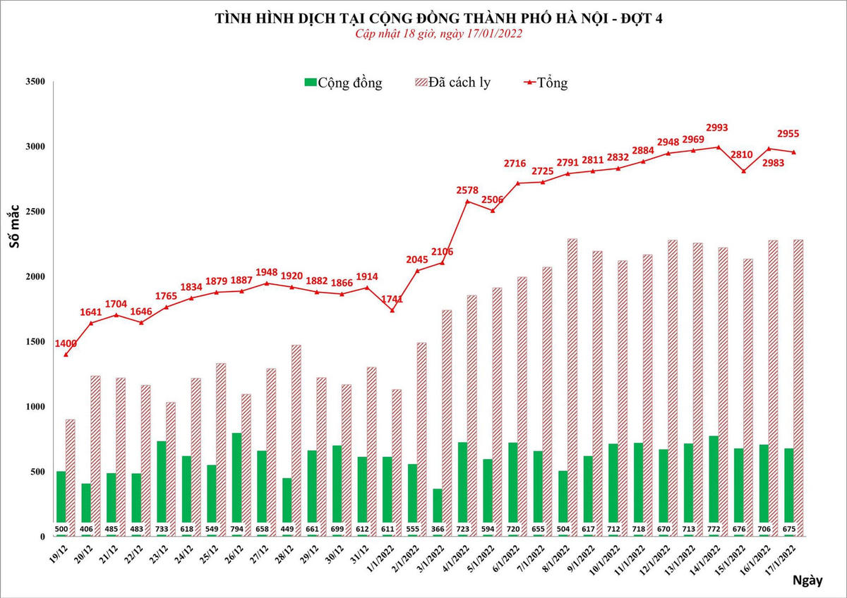 Bản tin Covid-19 Hà Nội ngày 17/1 do Sở Y tế phát đi tối nay cho thấy 24 giờ qua TP ghi nhận thêm 2.955 ca mắc mới, trong đó có 675 ca cộng đồng.