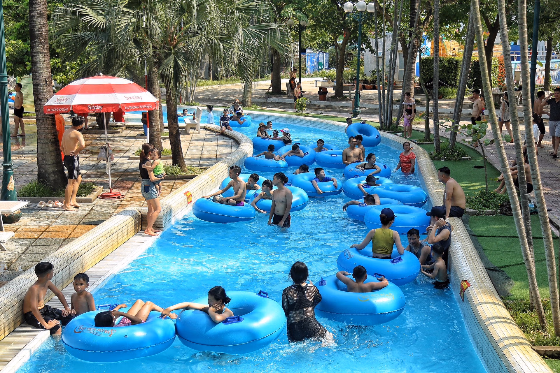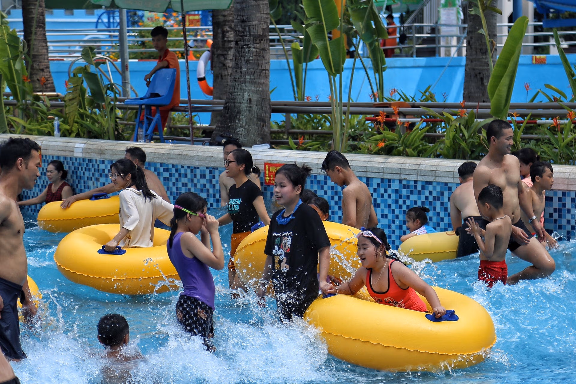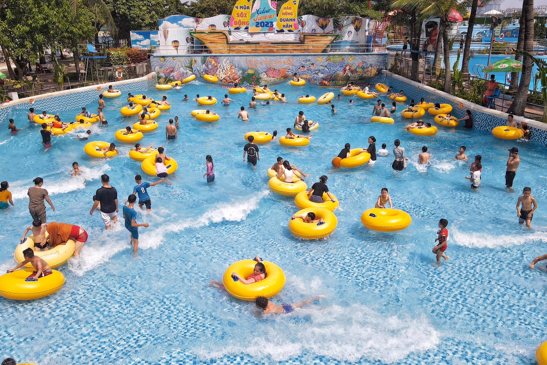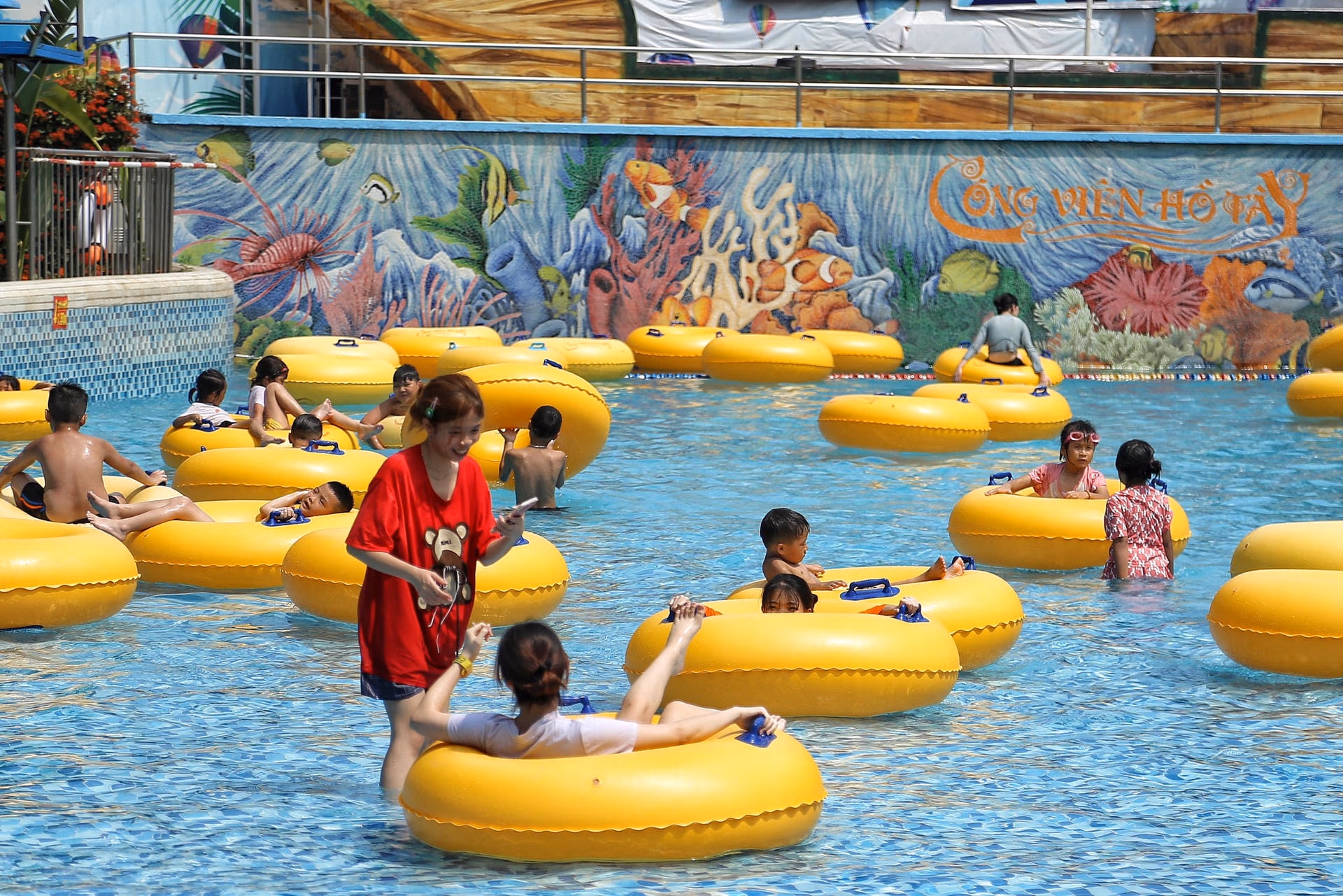 Hà Nội nắng như 'đổ lửa', người dân ùn ùn ra công viên nước giải nhiệt Thứ Bảy 03/06/2023 16:25 (GMT+7) Những ngày qua, thời tiết Hà Nội thường xuyên nắng nóng gần 40 độ C. Vì vậy, tại công viên nước Hồ Tây (quận Tây Hồ) thu hút đông đảo người dân, du khách đến giải nhiệt. Theo Trung tâm Dự báo Khí tượng Thuỷ văn Quốc gia, ngày 3/6 Hà Nội đêm không mưa, ngày nắng nóng, có nơi có nắng nóng gay gắt. Gió đông nam cấp 2-3. Nhiệt độ thấp nhất 28-30 độ C. Nhiệt độ cao nhất 36-38 độ C.Theo ghi nhận của PV Báo Đại Đoàn Kết Online chiều 3/6 rất đông người dân đã đổ về công viên nước Hồ Tây để giải nhiệt. Đa số đến đây là những bạn trẻ, những gia đình có con nhỏ.Đặc biệt thời tiết ngày hôm nay khá oi bức nên những địa điểm như công viên nước Hồ Tây càng thu hút người dân. Theo vị lãnh đạo công viên nước Hồ Tây, những ngày này thời tiết Hà Nội khá oi bức nên ngày hôm nay tại công viên nước Hồ Tây có khoảng 7-8.000 người đến để giải nhiệt. Đặc biệt, thời điểm này các em học sinh đang được nghỉ hè nên lượng đến công viên rất đông.Hiện mức giá được niêm yết ở khu vực bán vé là là 170.000 đồng/vé ngày thường; thứ 7 và Chủ nhật 190.000 đồng/vé đối với khách cao trên 135 cm. Khách từ 135 cm trở xuống, vé có giá 145.000 đồng/vé ngày thường; thứ 7 và Chủ nhật là 160.000 đồng/vé.Anh Nguyễn Tùng người dân trú tại quận Tây Hồ, Hà Nội cho hay, thời tiết Hà Nội đợt này rất nóng nên cuối tuần anh đã cho gia đình đến công viên nước để vui chơi giải nhiệt."Thời tiết ở ngoài rất nắng nóng nên vào công viên nước tôi cảm thấy rất thoải mái, mát mẻ", anh Tùng chia sẻ.Đa số người dân đến đây là các gia đình có con nhỏ.Trẻ em thích thú chơi đùa dưới làn nước mát, xua tan cái nóng oi bức.Những em nhỏ vui vẻ chơi đùa dưới bể bơi.Người dân thả mình dưới dòng nước mát.Nhiều người muốn thử trò chơi cảm giác mạnh ở khu trượt nước.Nhiều em nhỏ nép vào người phụ huynh để nghỉ ngơi. Lê Khánh