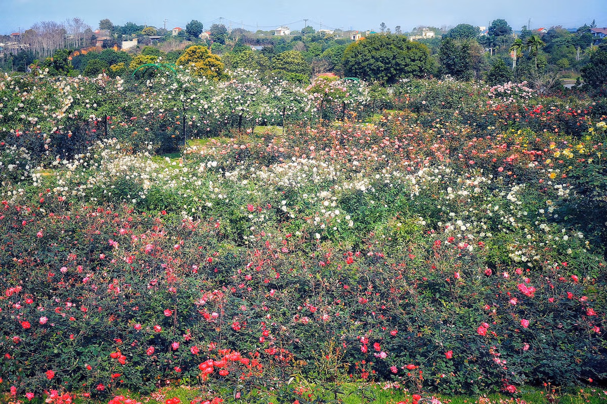 Hà Nội: Ngắm hơn 10.000 cây hoa hồng ngoại đua nhau khoe sắc rực rỡ Thứ Ba 14/02/2023 10:25 (GMT+7) Men theo ngọn đồi nằm ở xã Hòa Thạch, huyện Quốc Oai (Hà Nội) là vườn hoa hồng rộng 6.000 m2 của chị Thủy với hơn 10.000 cây hoa hồng ngoại đang khoe sắc. Với hơn 300 giống hồng ngoại, hơn 10.000 cây được trồng là vườn hồng của chị Thủy nằm trên ngọn đồi thuộc xã Hòa Thạch , huyện Quốc Oai hiện đang khoe sắc rực rỡ.Theo tìm hiểu, để có một vườn hoa hồng ngoại khổng lồ như thế này, vợ chồng chị Thủy đã phải ghép cành hoặc sưu tập ở các nhà vườn khắp Hà Nội.Chị Ngô Thu Thủy, chủ vườn hồng ngoại cho hay, chị đã từng ghép nhiều giống hoa ngoại đem bán ra thị trường. Nhưng cách đây vài năm, chị có nhận một vài dự án tạo dựng vườn hồng cho một số đơn vị nên nảy ra ý tưởng làm một khu vườn của riêng mình."Việc chăm sóc hoa hồng luôn được coi là một việc vô cùng khó khăn bởi khí hậu không thuận lợi hoa hồng sẽ rất dễ chết. Tuy nhiên, để chứng minh cho mọi người thấy những cây hoa hồng tưởng khó chăm, khó chiều chỉ trồng được ở châu Âu hay Đà Lạt, Sa Pa... thì ở Hà Nội vẫn trồng được", chị Thủy nhấn mạnh.Để thỏa mãn đam mê với hoa hồng, giữa năm 2022 chị Thủy đã mua mảnh đất khoảng 6.000 m2 ở quê để trồng hơn 10.000 cây hoa hồng.Theo chị Thủy, trước kia khi chưa trồng hoa hồng thì vườn đồi này chủ trước sử dụng trồng bưởi, đất đá khô cằn, nhiều đá nên vợ chồng chị đã cải tạo lại đất đồng thời bổ sung thêm nhiều phân gà, tro, trấu... để đất tơi xốp trở lại trước khi trồng hoa hồng."Những loài hoa tưởng như chỉ trồng được ở xứ lạnh như: Hồng Kate cánh nhún, Darby như bông hoa kẹo ngọt mùa thu, Sheherazad cánh xẻ thơm đậm, Golden, Blue sky, Blue bajou... đã được tôi chăm sóc vô cùng kỹ lưỡng chỉ mất chừng 4 tháng cây đã vươn cao, ngọn khỏe, trổ bông chi chít", chị Thủy chia sẻ.Những bông hoa hồng ngoại tỏa hương thơm ngát cả một khu vườn.Những bông hoa hồng ngoại thường có bông khá to tỏa ra một mùi hương dễ chịu. Lê Khánh
