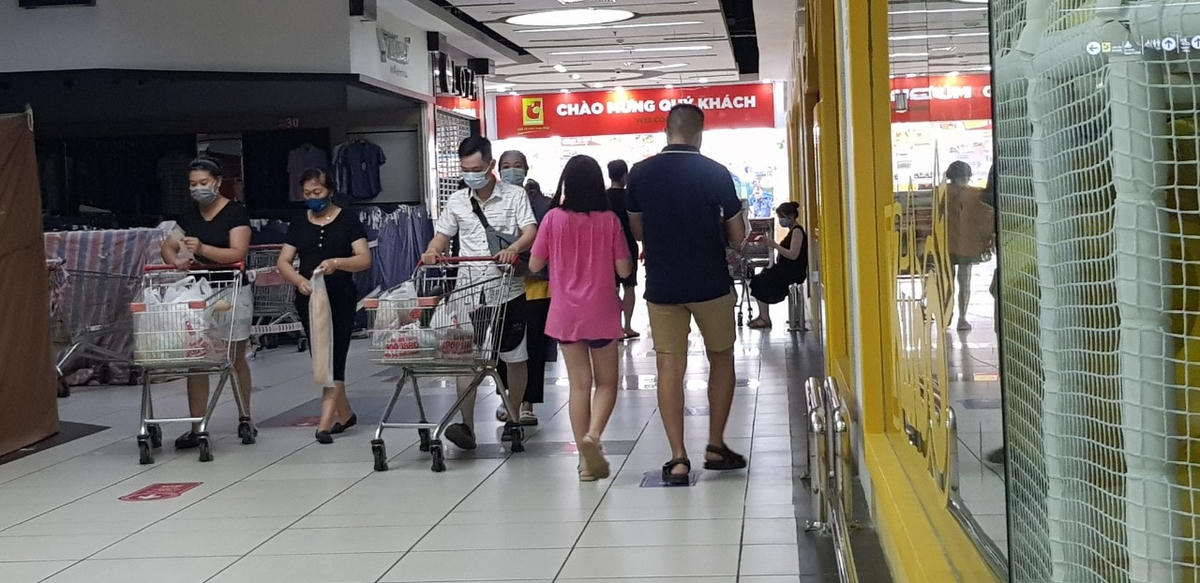 Chị H., thu ngân tại Aeon Mall Long Biên cho biết: "Siêu thị bên em vẫn hoạt động bình thường. Người dân chỉ cần khai báo y tế là được vào, ngoài ra không có quy định khác".