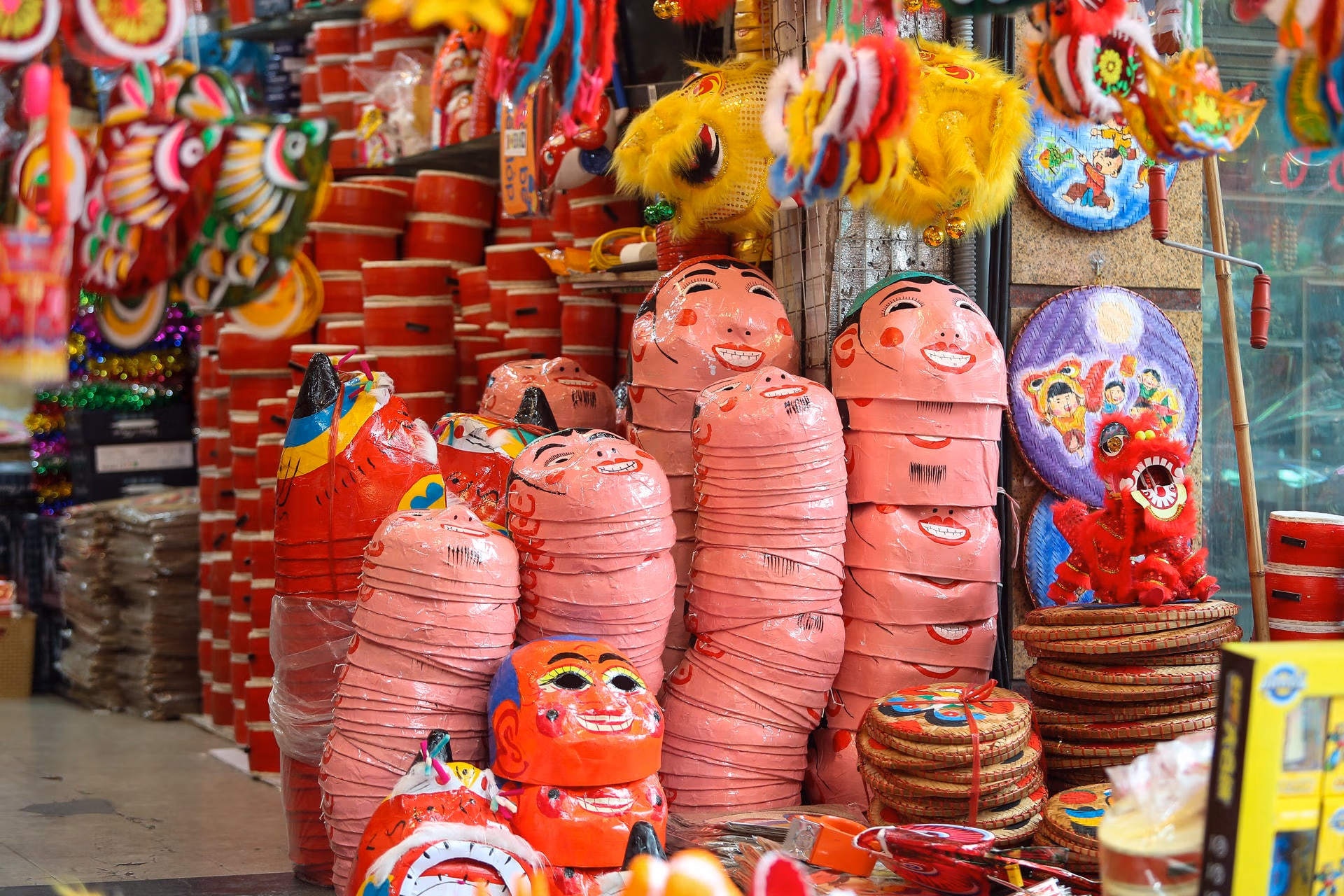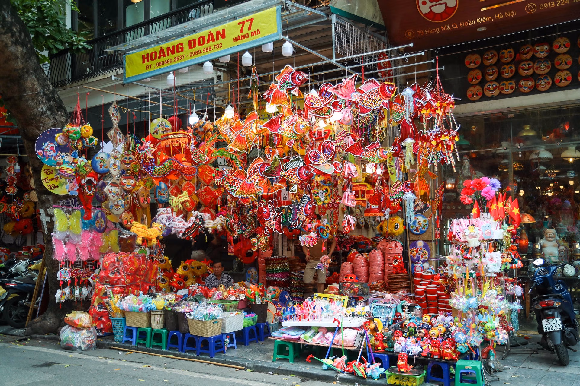 Hà Nội: Phố Hàng Mã lung linh sắc màu dịp cận Tết Trung thu Thứ Hai 21/08/2023 14:06 (GMT+7) Chỉ còn hơn một tháng mới đến Tết Trung thu nhưng phố Hàng Mã đã tràn ngập sắc màu đỏ, vàng bởi những mặt hàng trang trí. Phố Hàng Mã, quận Hoàn Kiếm, Hà Nội, nổi tiếng với sản phẩm thủ công truyền thống, đồ trang trí bằng giấy. Cứ mỗi khi đến Tết Trung thu, con phố này lại ngập tràn các đồ trang trí, các món đồ chơi bắt mắt.Mặt nạ giấy bồi in hình những con vật dễ thương, đầu sư tử vui nhộn, đèn ông sao rực rỡ, đèn kéo quân đủ loại to nhỏ và những chiếc đèn lồng các loại đẹp lung linh.Tuy nhiên, để đáp ứng nhu cầu của người tiêu dùng, nhiều mặt hàng thủ công được làm đẹp và tinh xảo.Theo ghi nhận của PV Báo Đại Đoàn Kết Online, dù còn hơn một tháng mới đến Tết Trung thu nhưng dọc phố Hàng Mã đã bày la liệt những chiếc đèn ông sao, kéo quân, mặt nạ giấy bồi, trống bỏi, vương miện, vòng hoa giấy, những chú kỳ lân hoặc thiên nga được làm thủ công...Dù chưa đến Tết Trung thu nhưng gian hàng nào trên phố Hàng Mã đều chật kín đồ trang trí.Để làm đẹp không gian nhà, cửa, nhiều bạn trẻ đã đến phố Hàng Mã.Những chiếc lồng đèn hình cá chép được làm rất đẹp mắt.Với không gian ngập tràn sắc đỏ vàng nhiều bạn trẻ còn tới nơi đây để lưu lại những bức hình đẹp.Nhiều chiếc lồng đèn được làm bằng hình tàu thuyền, có gắn tên 2 quần đảo của Việt Nam là Hoàng Sa, Trường Sa.Theo một số tiểu thương tại phố Hàng Mã, các sản phẩm đồ chơi truyền thống được sản xuất tại Việt Nam chiếm khoảng 60%, 40% còn lại là hàng nhập ngoại. Năm nay giá cả không có nhiều biến động so với năm trước. Vì lo kinh tế khó khăn, người dân thắt chặt chi tiêu. Lê Khánh