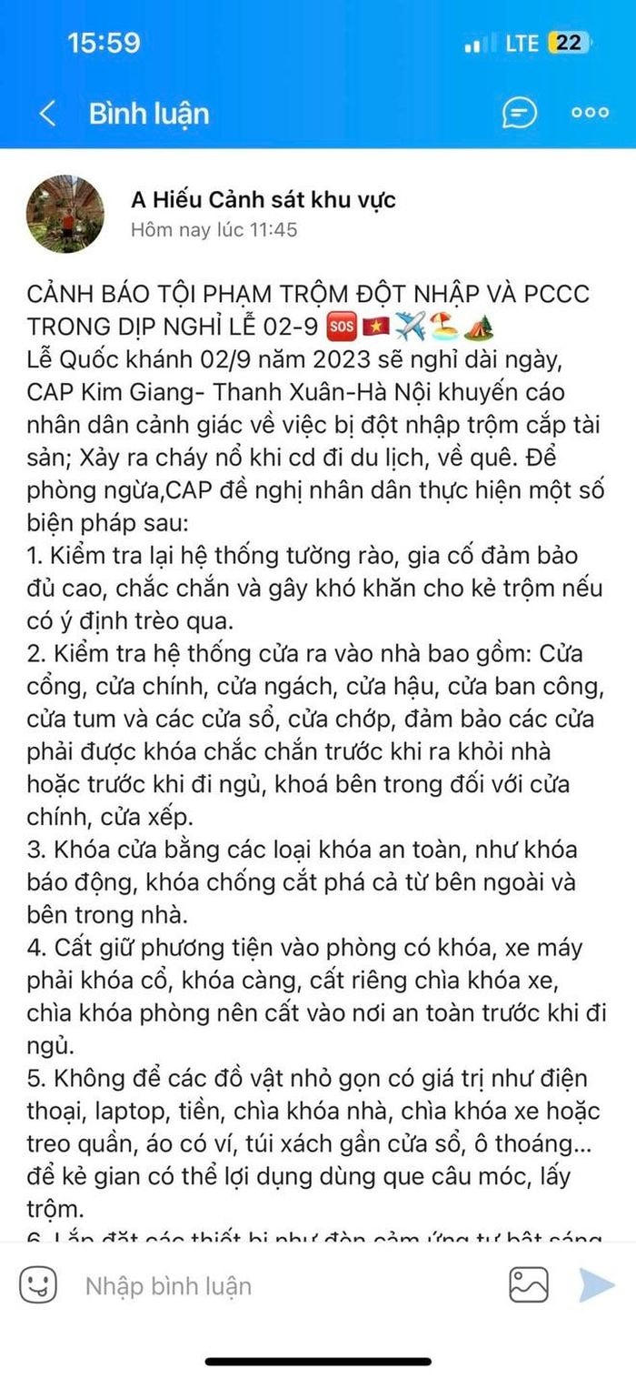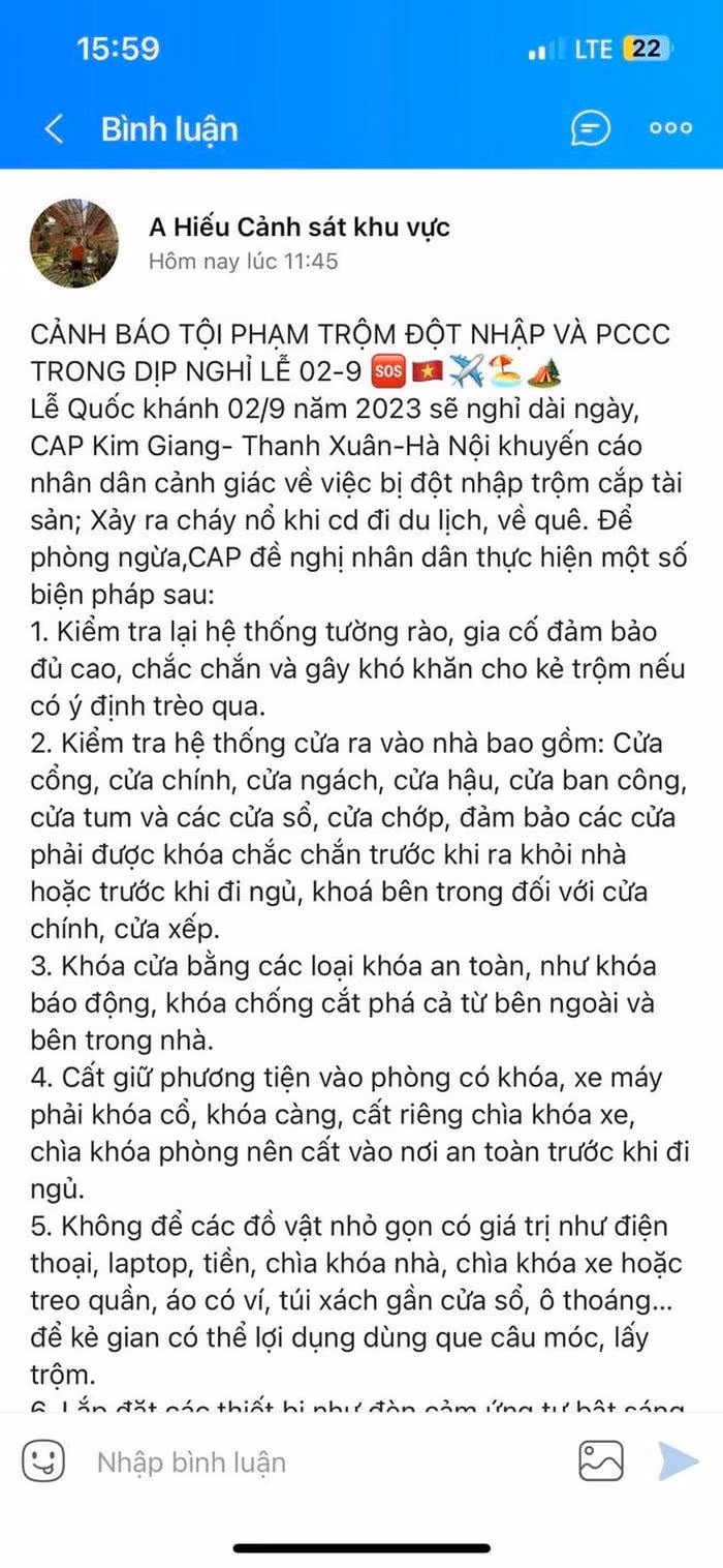 Mới đây, nhiều hội, nhóm zalo của các khu dân cư, người dân trên toàn địa bàn TP Hà Nội nhận được thông báo phòng ngừa tội phạm đột nhập trộm cắp tài sản, phòng cháy, chữa cháy trong dịp nghỉ lễ Quốc khánh 2-9 của Công an Hà Nội.