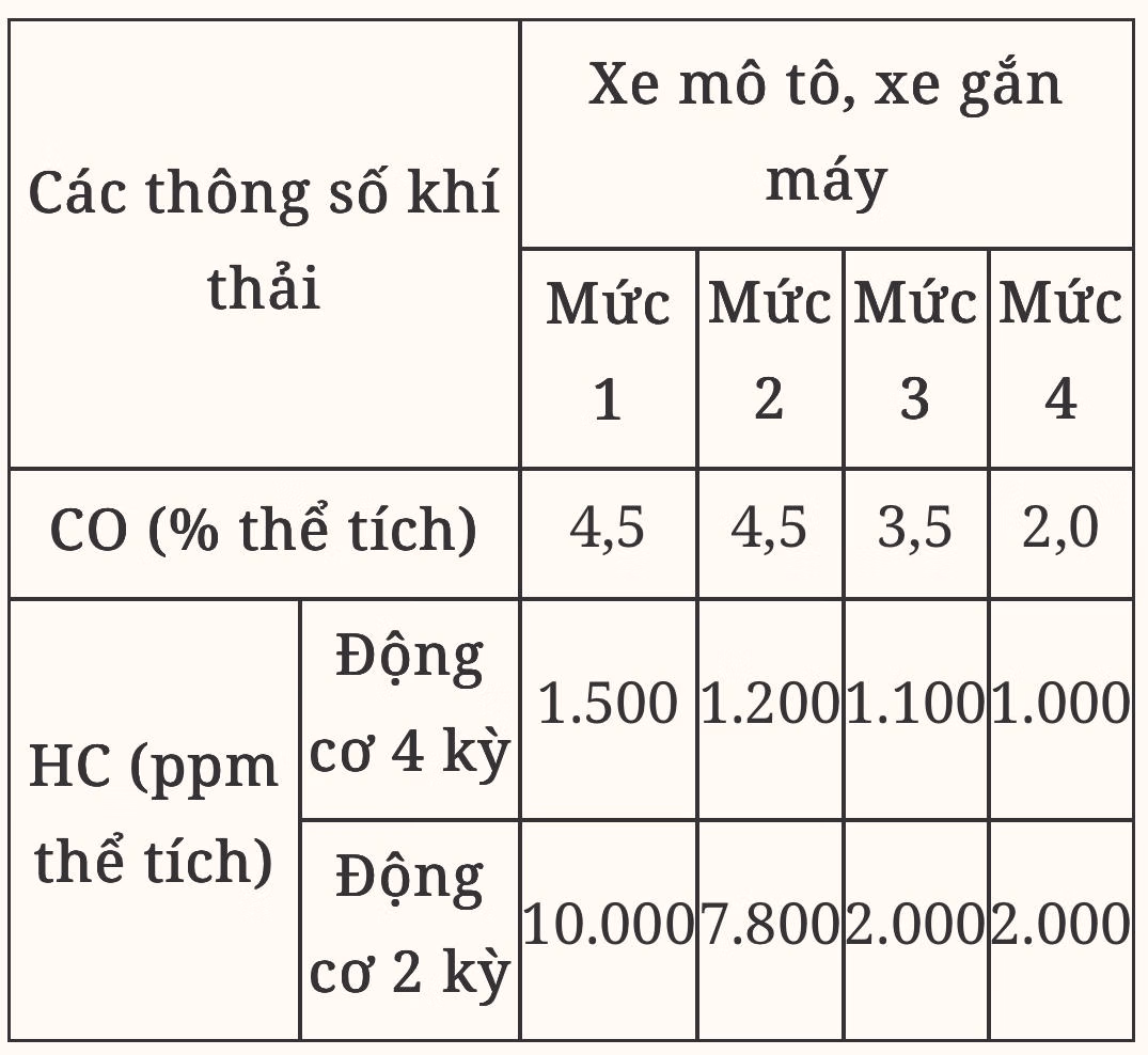 * Theo Thông tư số 92/2025/TT-BNNMT của Bộ Nông nghiệp và Môi trường, Quy chuẩn kỹ thuật quốc gia về khí thải xe mô tô, xe gắn máy tham gia giao thông đường bộ bao gồm 4 mức giá trị giới hạn tối đa cho phép đối với từng thông số Hydrocacbon (HC), Cacbon Monoxit (CO) trong khí thải xe mô tô, xe gắn máy tham gia giao thông đường bộ.