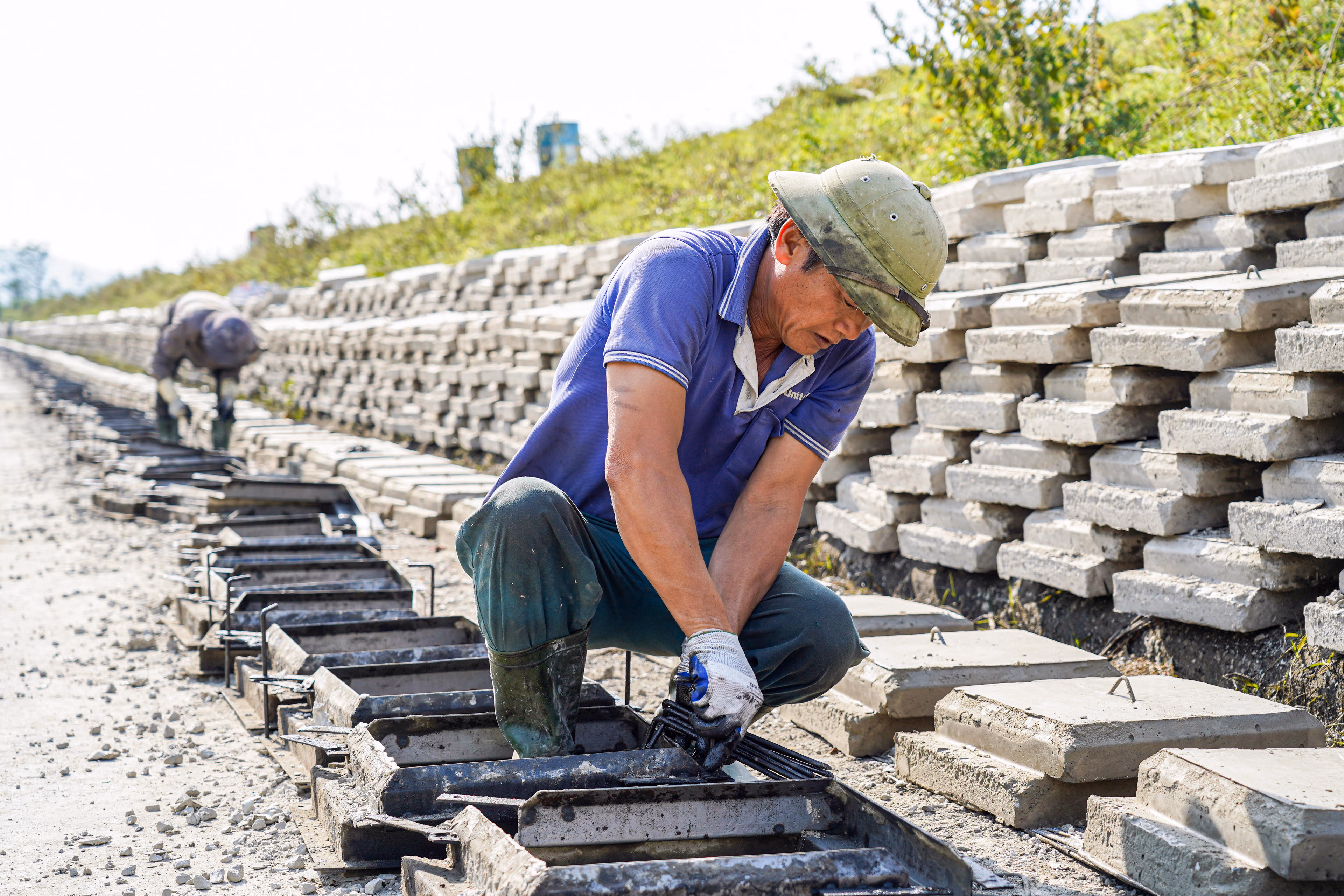 Kỹ thuật hiện trường Nguyễn Trọng Hào cho biết, trung bình mỗi ngày đơn vị duy trì khoảng 30 công nhân, 5 máy múc, 5 xe tải và nhiều thiết bị phụ trợ hoạt động liên tục. “Mỗi ngày nắng đều rất quý. Chúng tôi phải tranh thủ tối đa để hoàn thành các phần việc chính như bóc phong hóa, dựng khung dầm, đổ tấm lát. Mưa xuống là phải dừng ngay, nên từng giờ làm việc đều được tận dụng tối đa”, anh Hào nói.