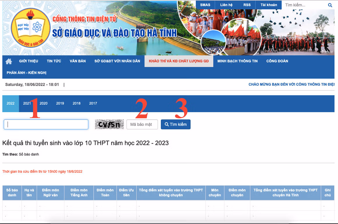 Theo đó, từ 15h00 ngày 18/6, Sở GD&ĐT Hà Tĩnh bắt đầu kích hoạt hệ thống tra cứu điểm thi vào lớp 10 THPT và THPT Chuyên Hà Tĩnh năm học 2022 - 2023.