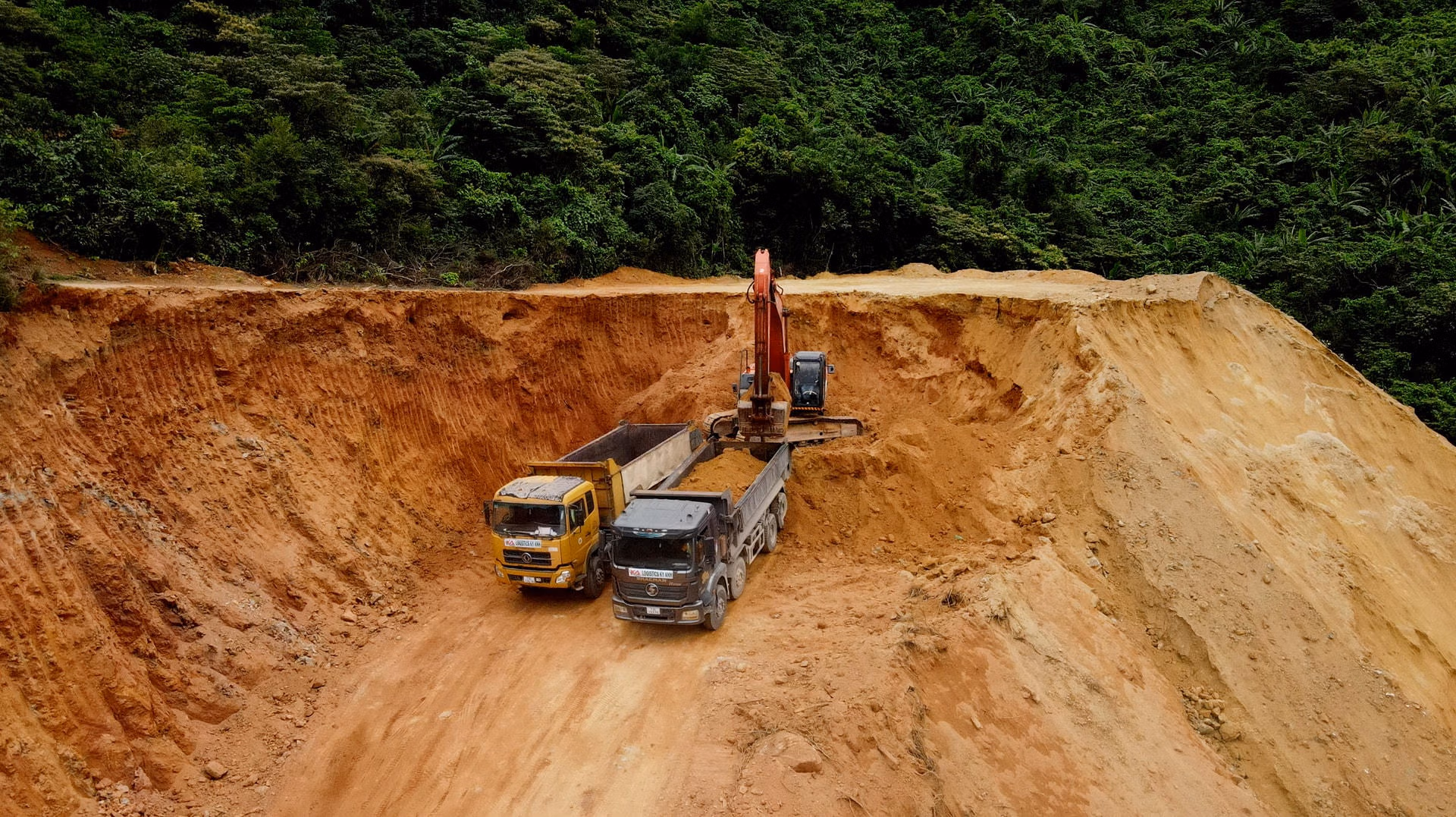 Tại đây, 2 chiếc xe tải đi sâu vào trong công trường dự án và di chuyển đến đổ đất tại vị trí của một gói thầu vừa phong hoá xong.