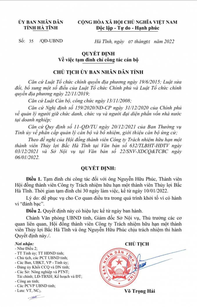 Giám đốc Công ty TNHH MTV Thuỷ lợi Bắc Hà Tĩnh Nguyễn Hữu Phúc vừa bị khởi tố về tội đánh bạc.