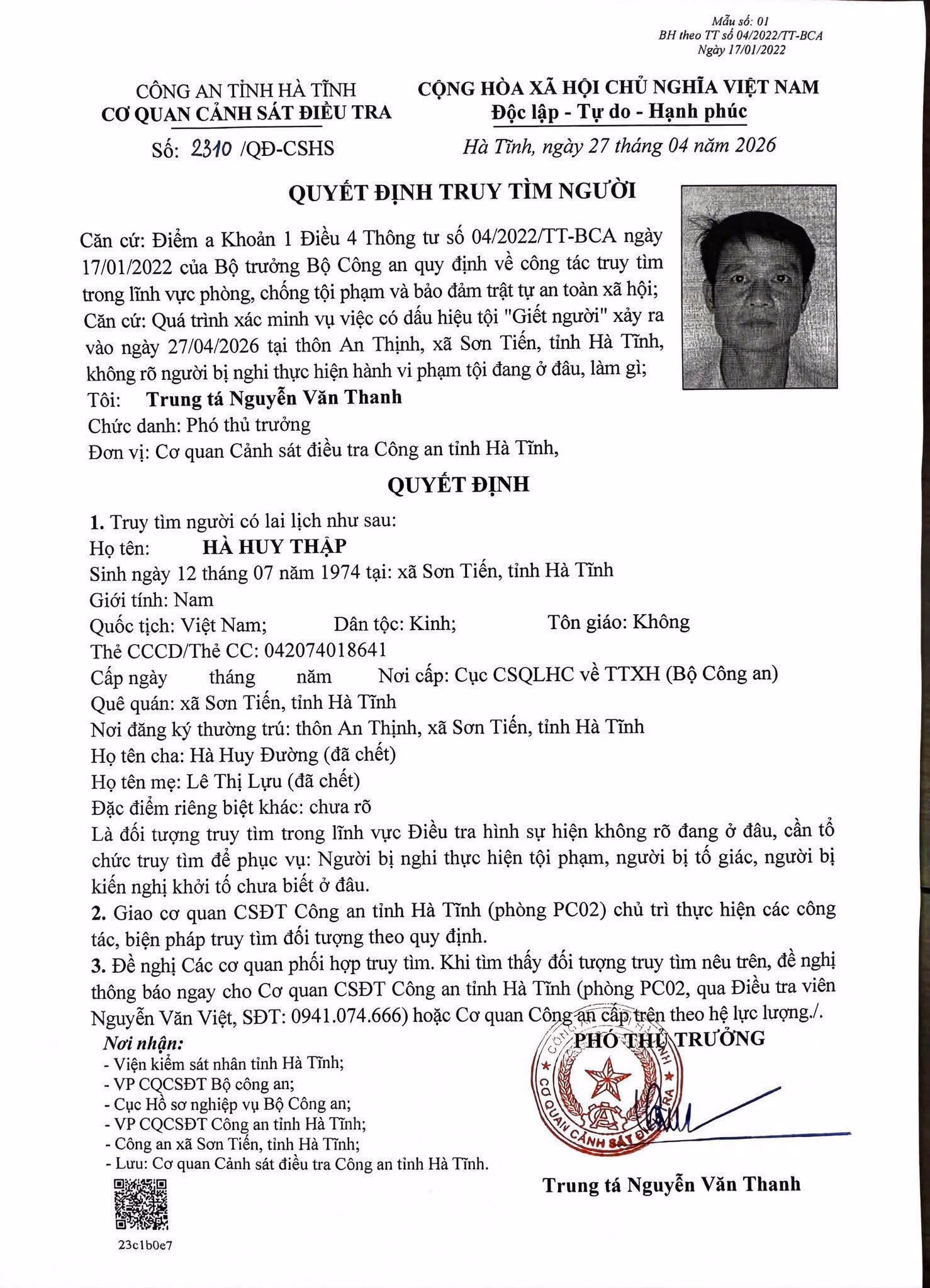 Quyết định tìm người được Cơ quan điều tra Công an tỉnh Hà Tĩnh ban hành tối 27/4. Theo đó, quá trình xác minh, cơ quan điều tra xác định có căn cứ về việc Hà Huy Thập (SN 1974), trú xã Sơn Tiến, tỉnh Hà Tĩnh có dấu hiệu tội “giết người” xảy ra tại thôn An Thịnh, xã Sơn Tiến.