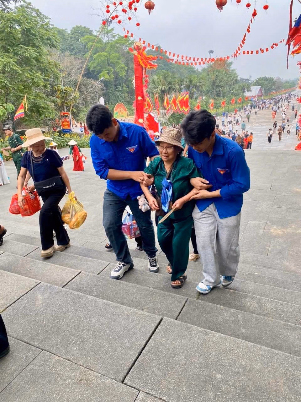 Trên khắp lối đi, bậc đá, sân đền, hình ảnh những chàng trai, cô gái Đất Tổ áo xanh ướt đẫm mồ hôi dưới tiết trời oi nóng nhưng hoạt bát, nhanh lẹ và tươi tắn cầm tay dìu đỡ cụ già lên đền hay cúi nhặt từng mẩu rác, đã để lại ấn tượng đẹp trong lòng du khách.