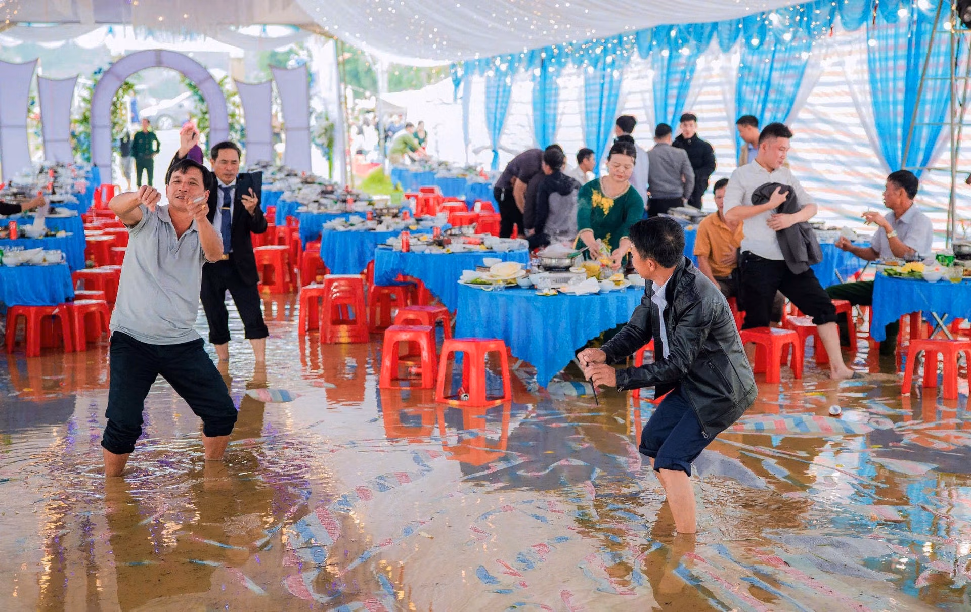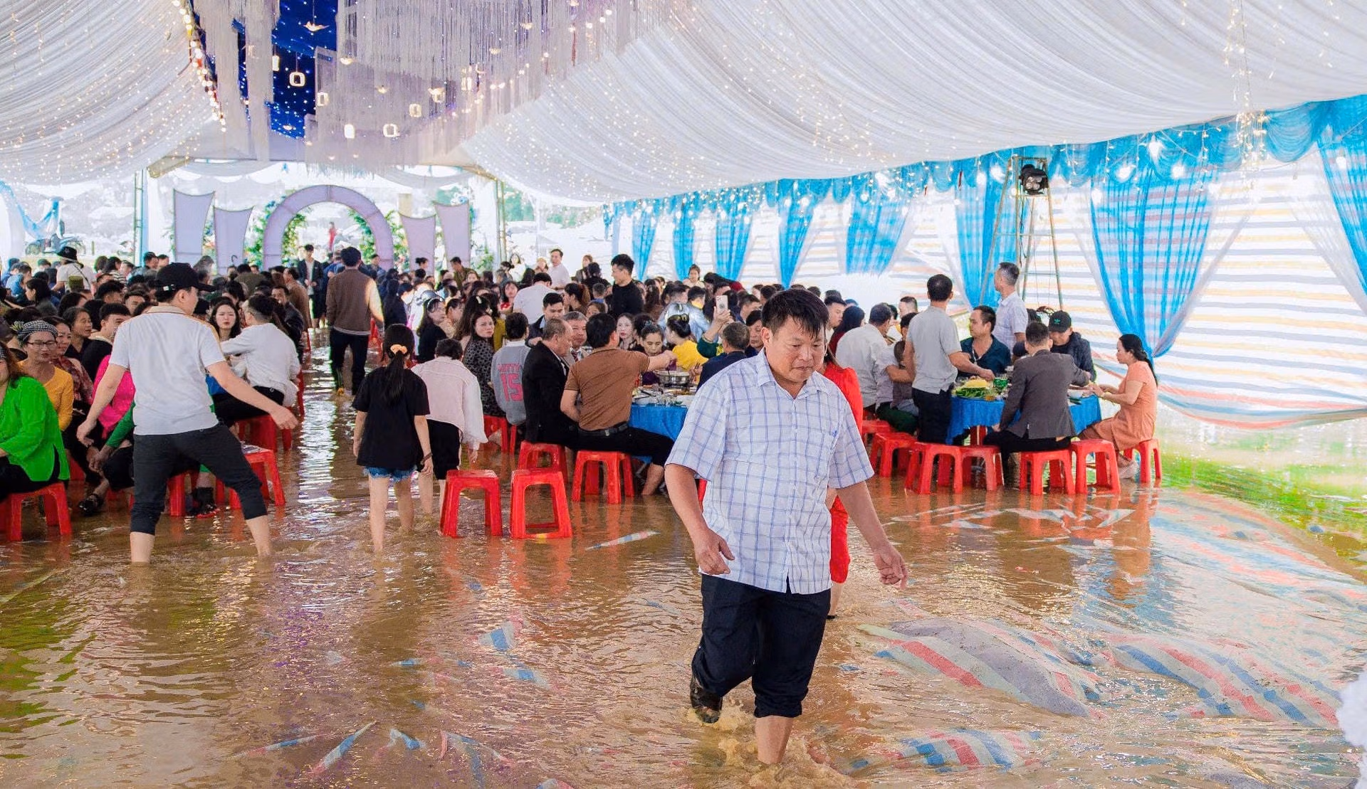 Để vào hội trường chung vui, nhiều khách mời đã thả giày dép, xắn quần lội qua dòng nước và vào bàn tiệc ăn cỗ trong cảnh chân ngâm nước lạnh. Thậm chí cô dâu, chú rể cũng vén cao quần áo mới có thể bước đến được hôn trường.
