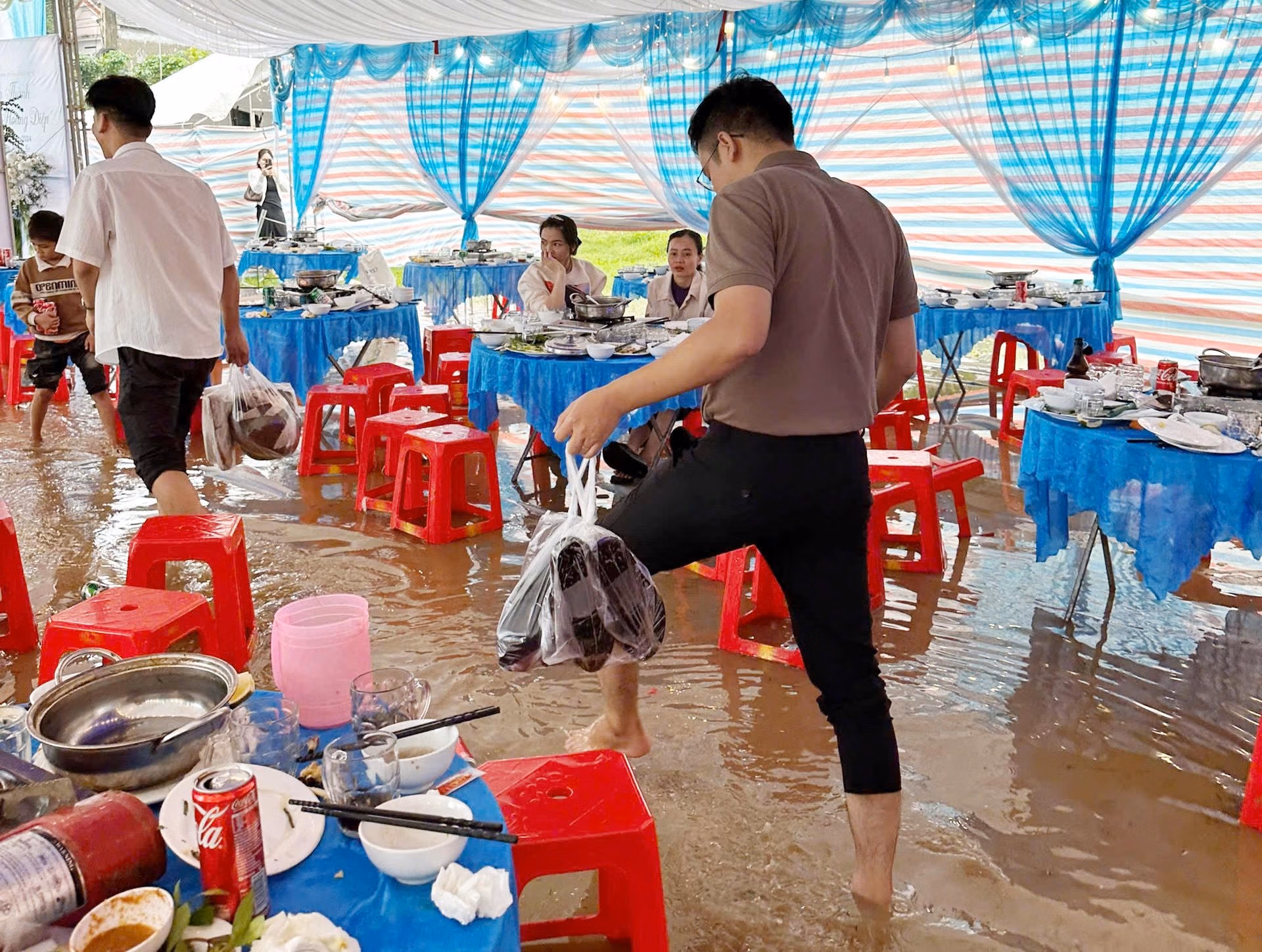 Tuy nhiên, mưa lớn kéo dài, khiến gia đình anh Thành không kịp chuyển rạp cưới đến vị trí khác. Đến sáng ngày 6/11, nước lũ đã lấp xấp khoảng 30-60cm trong rạp cưới khiến người nhà khá lo lắng.