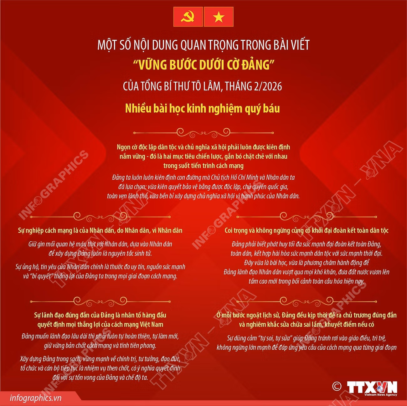 Trong bài viết “Vững bước dưới cờ Đảng” tháng 2/2026, Tổng Bí thư Tô Lâm khẳng định hành trình 96 năm của Đảng đã để lại nhiều bài học kinh nghiệm quý báu như: Ngọn cờ độc lập dân tộc và chủ nghĩa xã hội phải luôn được kiên định nắm vững - đó là hai mục tiêu chiến lược, gắn bó chặt chẽ với nhau trong suốt tiến trình cách mạng; Sự nghiệp cách mạng là của Nhân dân, do Nhân dân, vì Nhân dân; coi trọng và không ngừng củng cố khối đại đoàn kết toàn dân tộc…