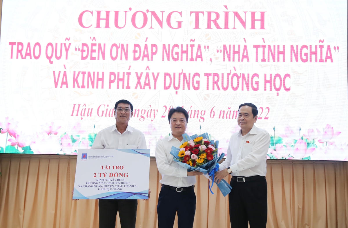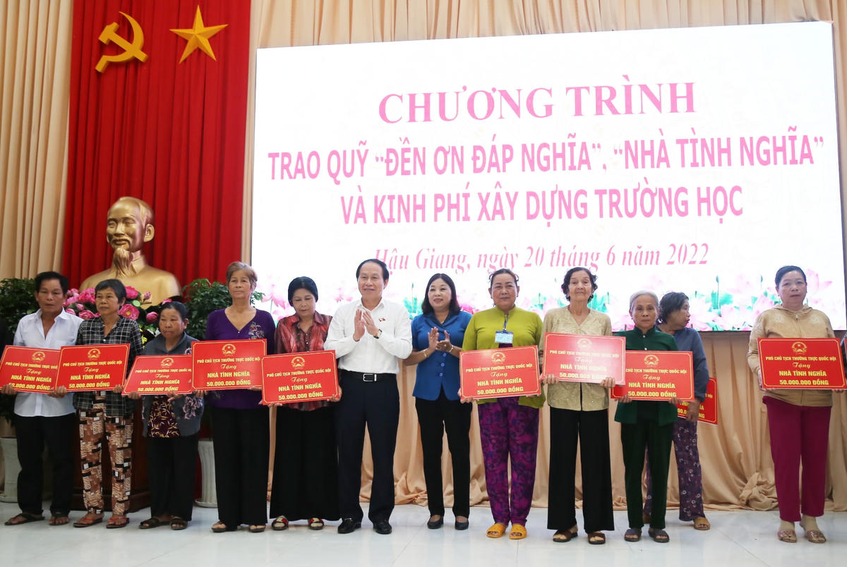 Theo đó, Phó Chủ tịch Thường trực Quốc hội Trần Thanh Mẫn cùng Phó Chủ tịch - Tổng Thư ký UBTƯ MTTQ Việt Nam Lê Tiến Châu đã trao 8 tỷ đồng trong đó 3 tỷ cho quỹ đền ơn đáp nghĩa, 3 huyện (Châu Thành 1 tỷ, Châu Thành A 1 tỷ, Vị Thuỷ 1 tỷ); trao 3 tỷ kinh phí hỗ trợ cho huyện Long Mỹ xây trường học và trao 2 tỷ hỗ trợ xây dựng trường học cho huyện Châu Thành A. Ngoài ra, còn trao 30 căn nhà cho các hộ chính sách nghèo và cận nghèo ở 3 huyện (Châu Thành A 10 căn, Châu Thành 10 căn, Vị Thuỷ 10 căn).