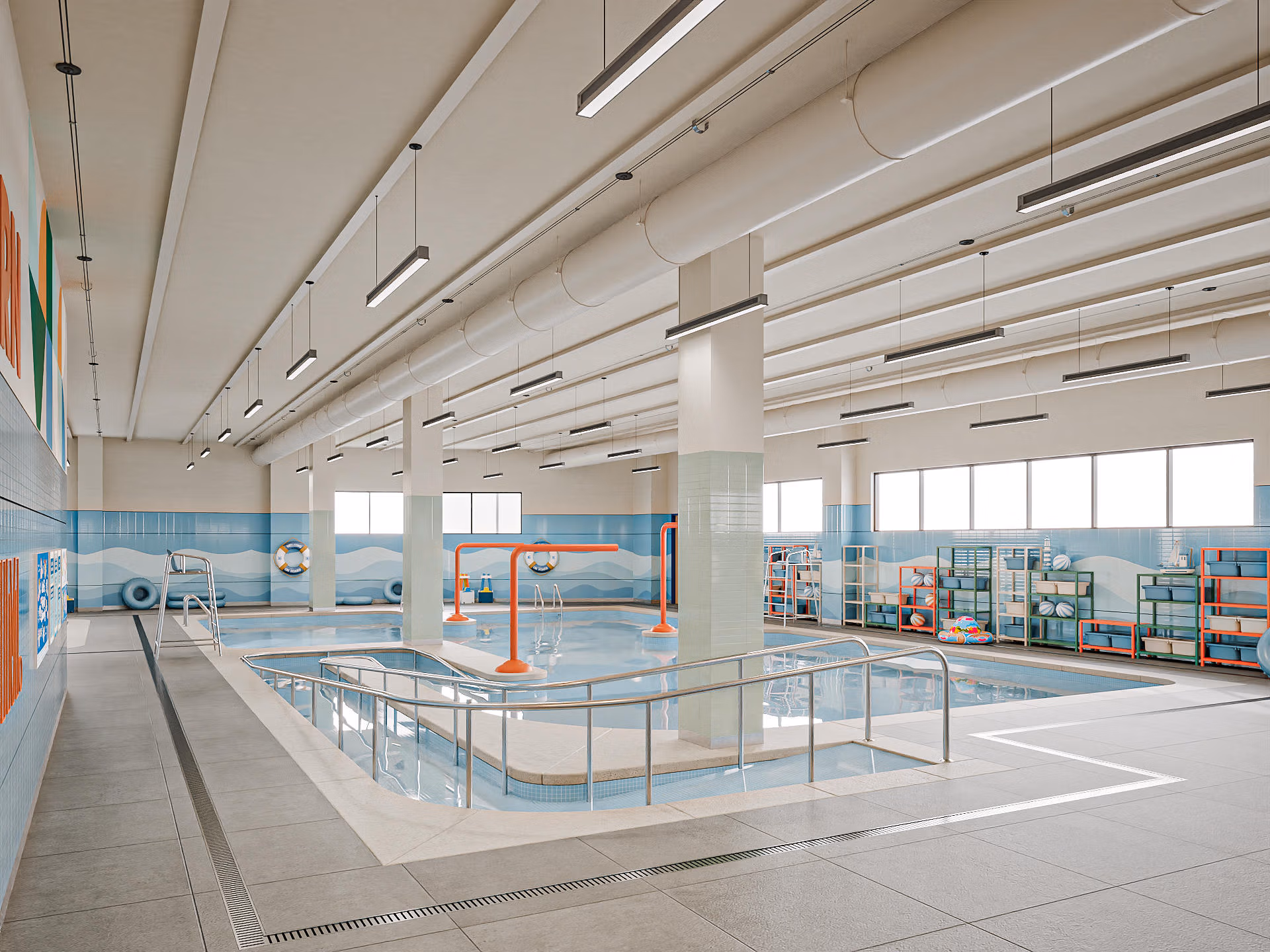 Bên trong, các khu học tập, vui chơi được phân vùng chức năng rõ ràng, luồng di chuyển dễ dự đoán, các khu vực “hạ nhiệt” cảm xúc được bố trí khoa học, từ đó giúp giảm tải giác quan, tăng khả năng tập trung, cảm giác an toàn và tính độc lập trong không gian học tập, sinh hoạt. Hệ thống phòng chức năng chuyên sâu như bể bơi thủy trị liệu, phòng điều hòa cảm giác, phòng yên tĩnh, không gian giả lập và các phòng can thiệp theo độ tuổi… được thiết kế phù hợp với đặc thù từng nhóm học sinh, bảo đảm tính sư phạm và hiệu quả hỗ trợ lâu dài.