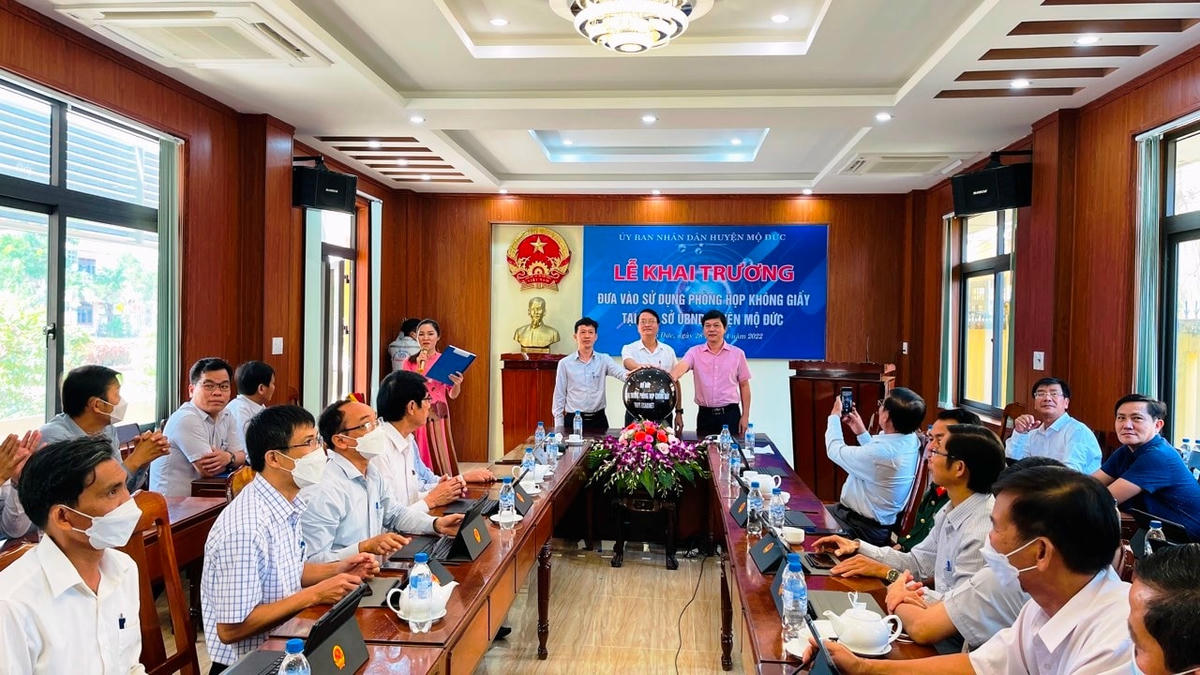 Hiện nay ở tỉnh Quảng Ngãi, sau cơ quan Tỉnh ủy, huyện Mộ Đức là địa phương đầu tiên triển khai thí điểm mô hình phòng họp không giấy cho một số cuộc họp. Lãnh đạo huyện Mộ Đức cho biết, mô hình phòng họp này đã chính thức áp dụng từ tháng 4/2022. Để thực hiện hiệu quả, huyện đã đầu tư khoảng 500 triệu đồng và trang bị 25 máy tính bảng, sử dụng phần mềm e-Cabinet của VNPT... cùng với đó huyện đã chuẩn bị một phòng họp khang trang, đồng thời ban hành các quy định chung về quản lý, vận hành dành cho các cá nhân, đơn vị được quyền sử dụng.