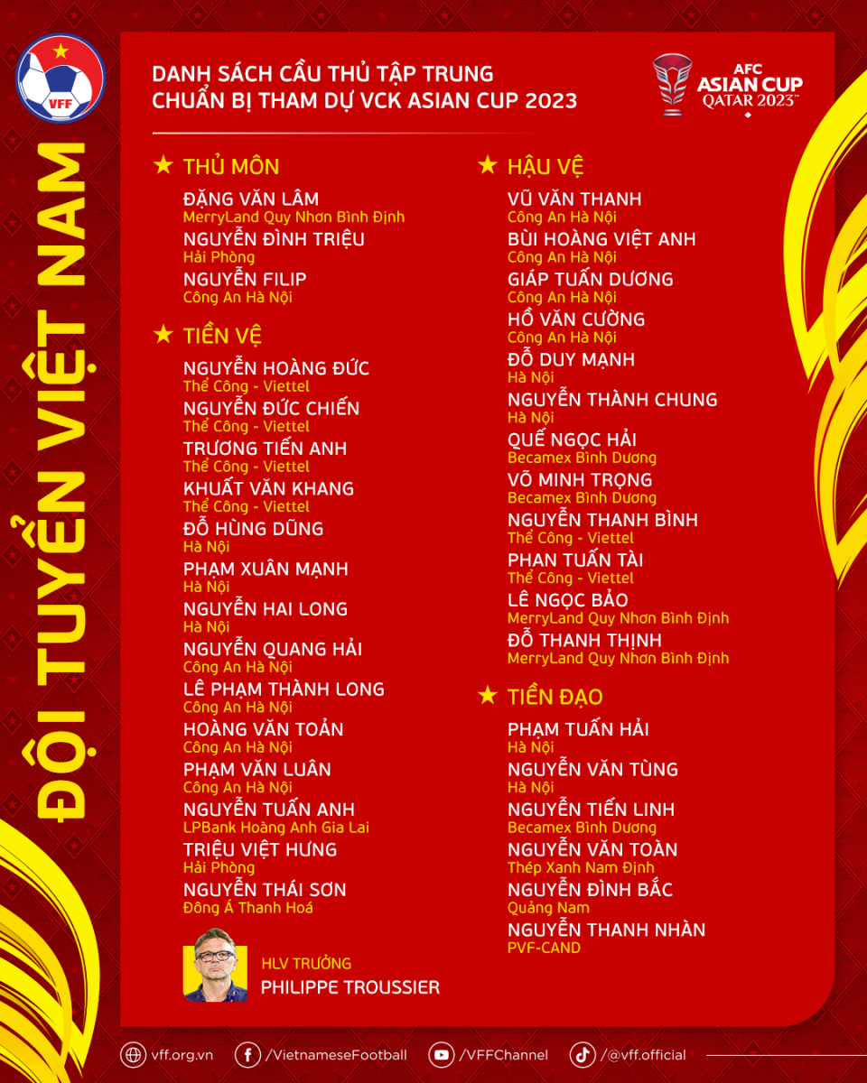 Trước đó, nằm trong kế hoạch chuẩn bị cho VCK Asian Cup 2023, chiều 25/12, HLV Troussier đã lựa chọn ra 34 cầu thủ vào danh sách tập trung tháng 12/2023 của đội tuyển Việt Nam.