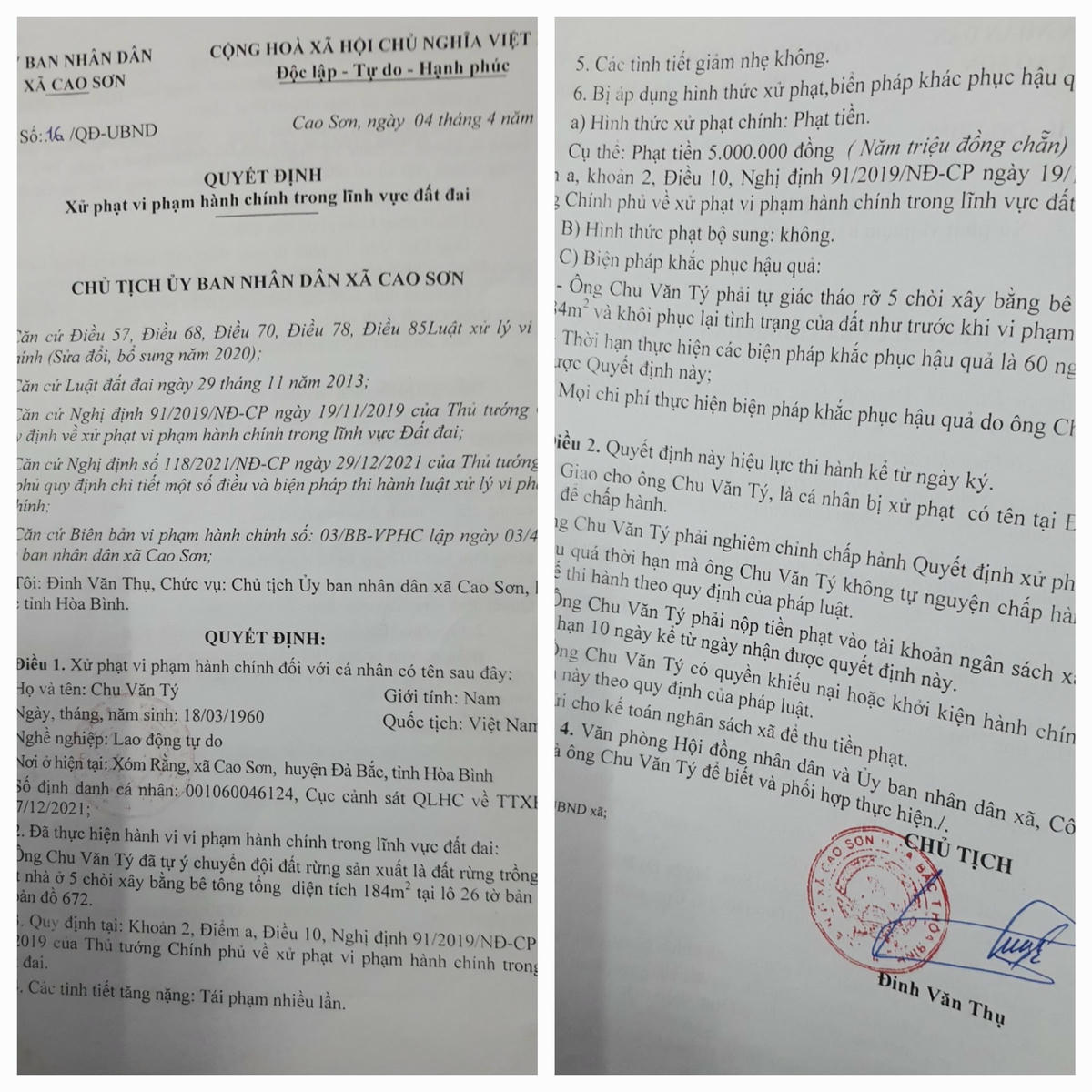 Ông Thụ cho biết, khu đất có các công trình trái phép kể trên, trước đây là đất của Lâm trường Tu Lý (thuộc Công ty TNHH MTV Lâm Nghiệp Hoà Bình), do hộ gia đình ông Chu Văn Tý sinh sống, ở nhiều năm nay, có diện tích khoảng 7.000 m2. Từ năm 2022, ông Tý có chuyển nhượng lại khu đất trên cho một người tên là Hùng, sau đó, họ mới tiến hành kè suối, xây dựng nhà sàn và 5 căn chòi bằng bê tông cạnh bờ suối. UBND xã Cao Sơn đã kiểm tra, lập biên bản, và xử phạt vi phạm hành chính 4 lần đối với trường hợp hộ ông Tý, mỗi lần xử phạt là 5.000.000 đồng.