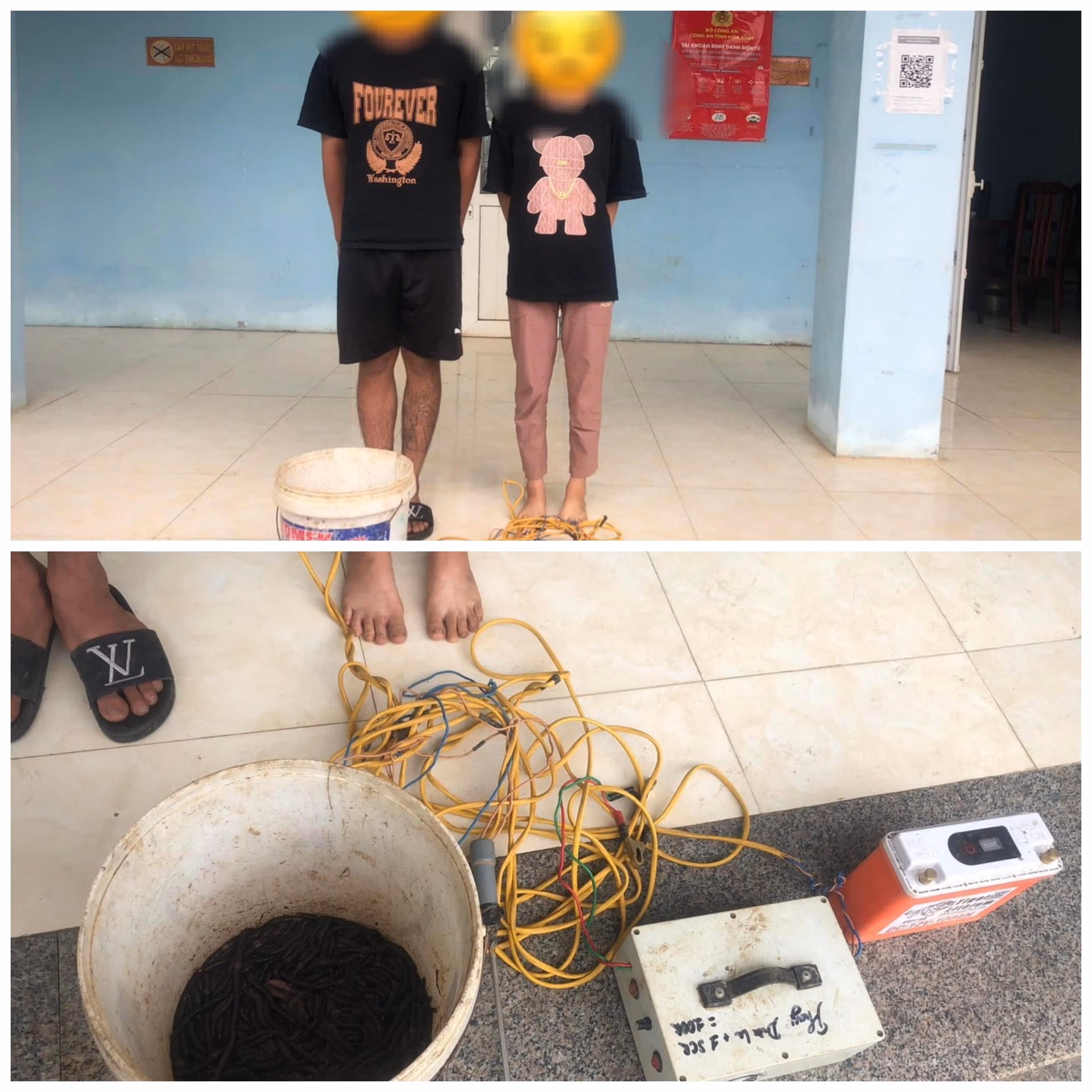 Cụ thể, khoảng 8h ngày 29/8, Công an xã Vĩnh Đồng (huyện Kim Bôi) cùng địa chính nông xã kiểm tra, phát hiện và bắt quả tang hai đối tượng B.M.T. (SN 2005, trú tại xóm Sằn, xã Hợp Tiến, huyện Kim Bôi, tỉnh Hòa Bình) và B.T.A. (SN 2006, trú tại xóm Đoàn Kết, xã Vĩnh Đồng, huyện Kim Bôi, tỉnh Hòa Bình) đang có hành vi sử dụng kích điện khai thác giun đất tại xóm Đoàn Kết (xã Vĩnh Đồng).