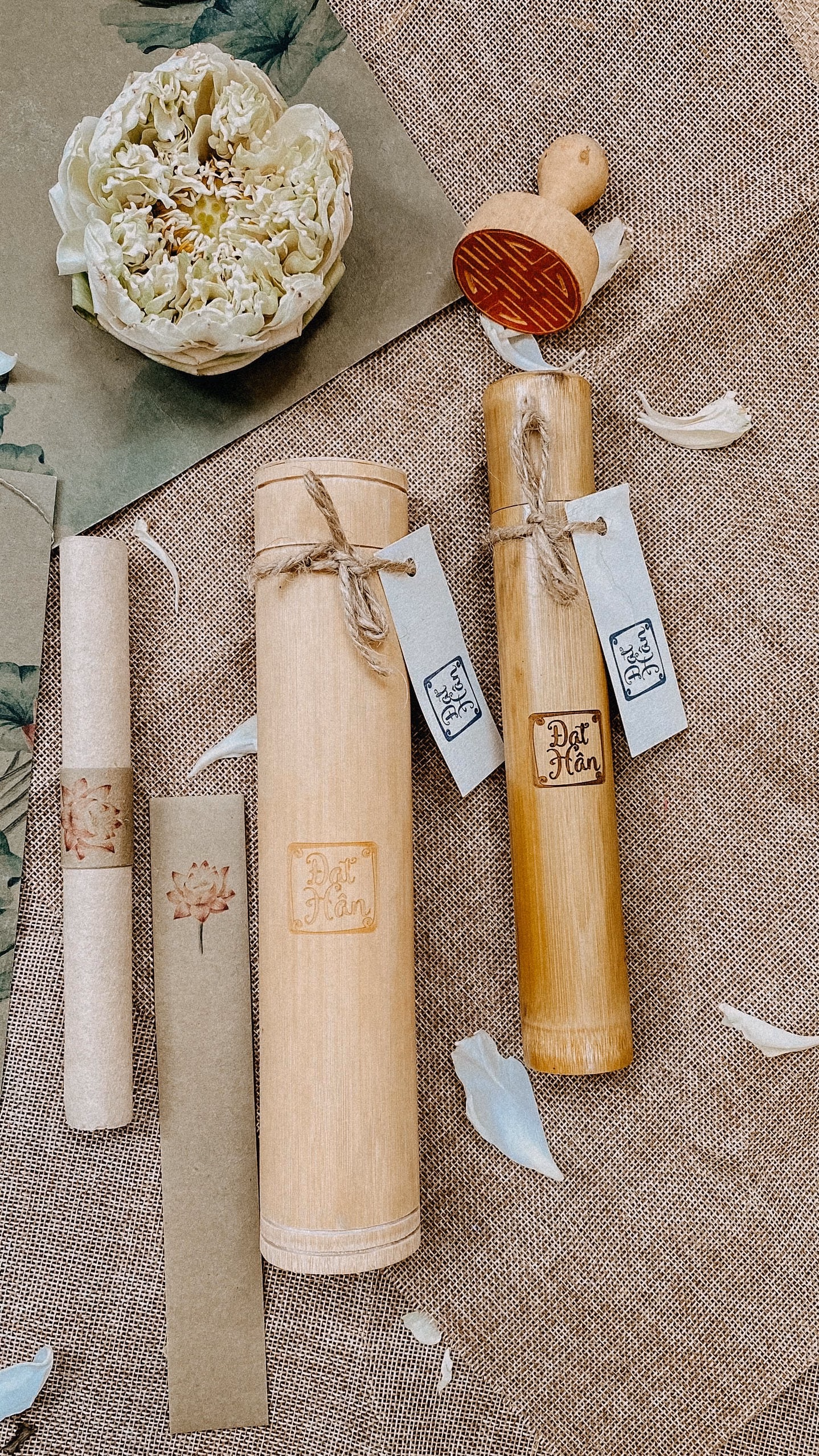 “Không phải tấm thiệp mà là cây thiệp. Không phải giấy thường mà là giấy dó. Không phải phong bao mà là ống tre. Trên ống tre còn tỉ mỉ khắc logo được cách điệu từ dấu triện. Đặc biệt, hình ảnh hoa sen vốn đã gắn liền với những thiết kế áo dài của Hân nay lại được khoe sắc trên bộ thiệp cưới đượm màu dân tộc”, hoa hậu Ngọc Hân bật mí về điều đặc biệt ở hôn lễ của mình.
