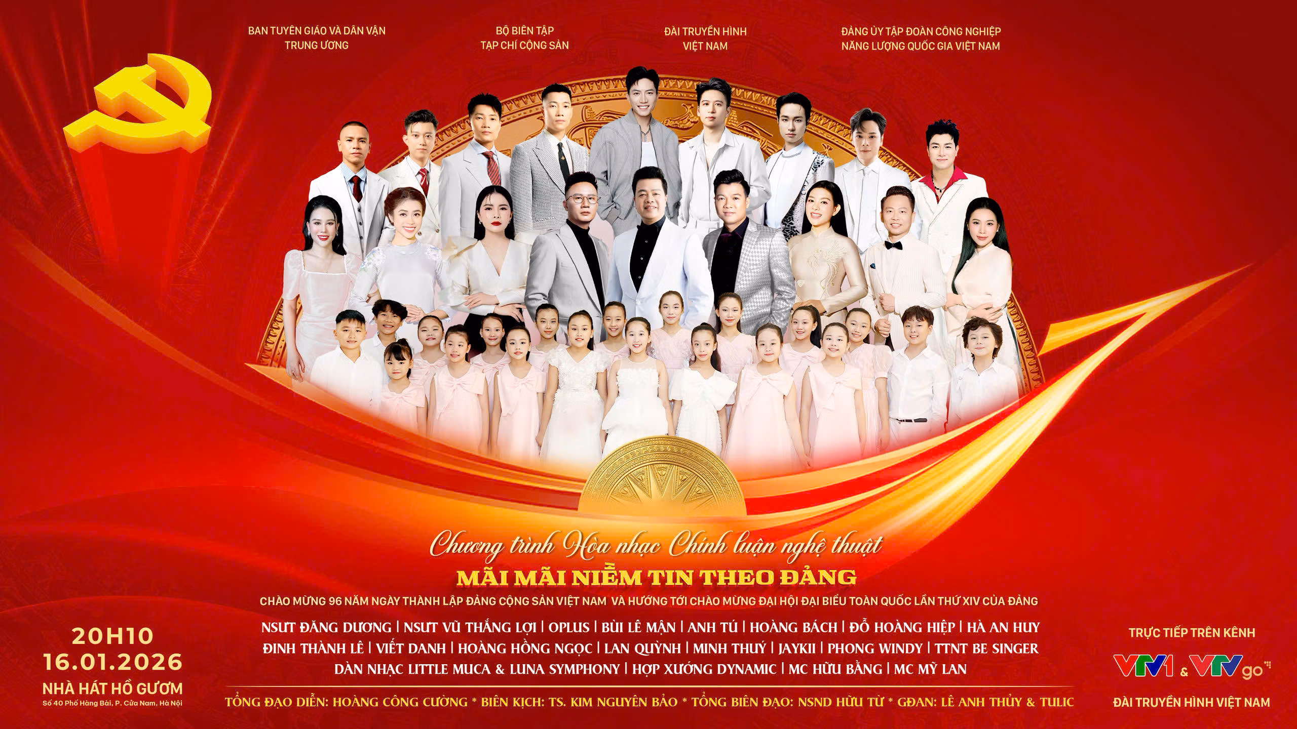 Ngày 16/1, tại Nhà hát Hồ Gươm (Hà Nội), sẽ diễn ra chương trình hòa nhạc chính luận nghệ thuật đặc biệt “Mãi mãi niềm tin theo Đảng”. Chương trình được truyền hình trực tiếp trên kênh VTV1của Đài Truyền hình Việt Nam.