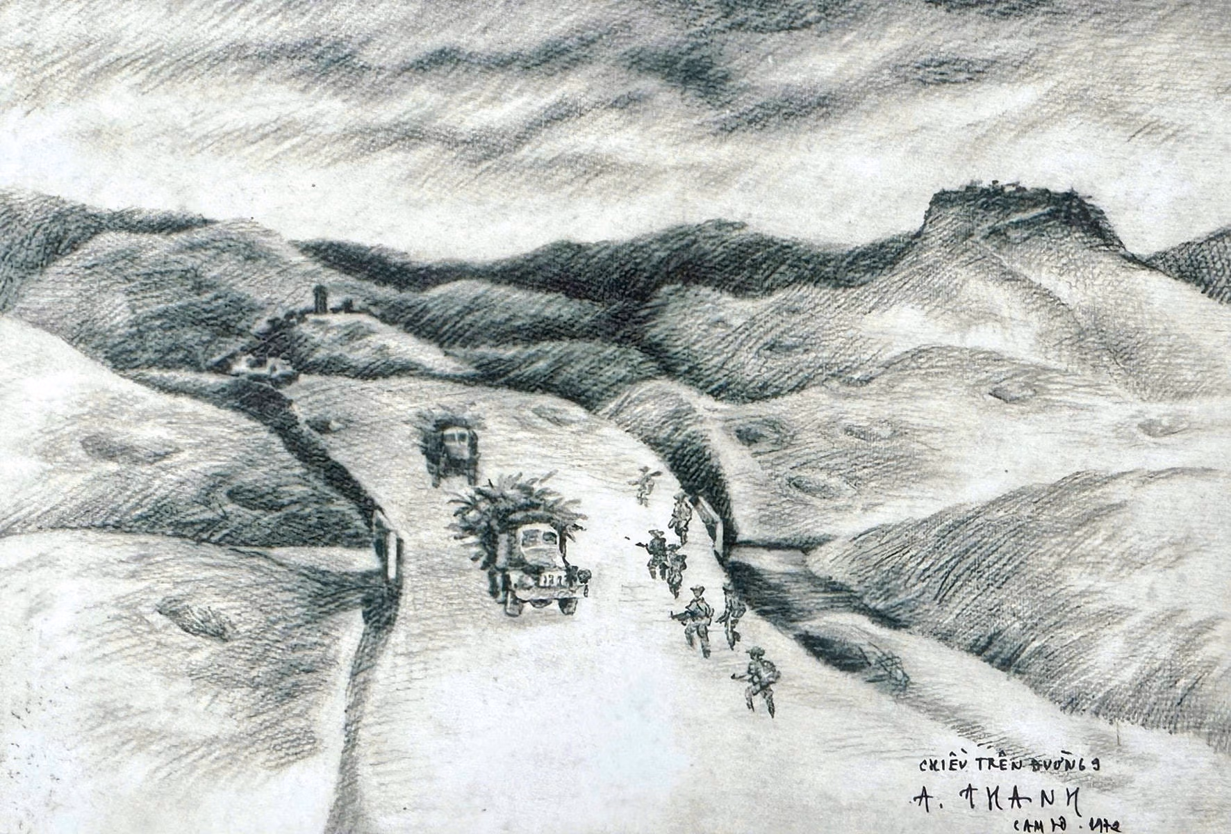 Nhân kỷ niệm 50 năm ngày đất nước thống nhất, xin giới thiệu một số bức ký họa chiến trường và tác phẩm sơn mài “Cô gái mở đường” của họa sĩ Thành Chương.