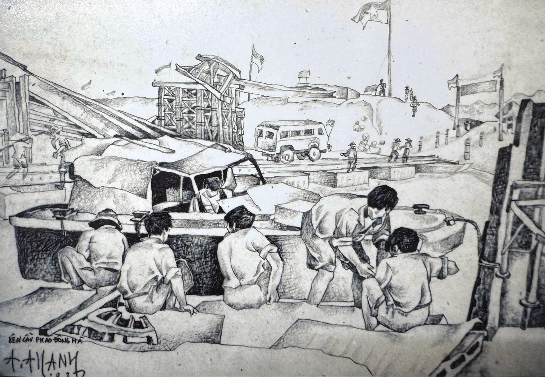 Đây là những bức tranh được ký họa từ khoảng năm 1967 đến năm 1972, ở chiến trường Đường 9, Hà Tĩnh, Quảng Trị…, ký bút danh Trường Thanh. Ở tuổi 76, họa sĩ Thành Chương nhớ lại: “Cuối những năm 1960, gia đình tôi có một suất cho con đi Đức học tập nhưng tôi nghĩ, thanh niên thế hệ Hồ Chí Minh, lúc Tổ quốc đang nước sôi lửa bỏng chiến đấu chống quân xâm lược, làm sao mình có thể chọn con đường nhàn hạ, ấm êm đi ra nước ngoài. Tôi nung nấu quyết tâm gác lại tất cả để xung phong vào miền Nam chiến đấu. Khi quyết định không đi nước ngoài, tôi nói với cha tôi là nhà văn Kim Lân, ông cụ lặng người. Làm cha, ai cũng có những tính toán cho con. Cụ đưa tôi về Tạp chí Văn nghệ Quân đội, chỗ bác Chính Hữu, làm họa sĩ của Tạp chí. Tôi dứt khoát không đồng ý. Ông cụ lại định giới thiệu tôi về Đội văn công Quân khu 3. Nhưng tôi không thay đổi ý chí. Tôi viết huyết thư xin vào miền Nam chiến đấu. Vì thế, tôi được biên chế về Đoàn Công binh 239. Tôi vào chiến trường một mạch 9 năm, làm lính công binh rà phá bom mìn, dẫn đường cho tàu phà, xe cộ vào chiến trường miền Nam tại đoạn bến phà Linh Cảm (Hà Tĩnh) cho đến ngày giải phóng. Rất nhiều câu chuyện trong 9 năm bom đạn ác liệt ấy tôi đã chứng kiến, đã trải qua và đã ghi chép trong những bức ký họa của mình”.