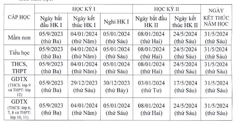 Ngày khai giảng là ngày 5/9. Các cấp học dự kiến kết thúc học kỳ I ngày 12/1/2024. Học kỳ II hoàn thành giáo dục ngày 24/5/2024.