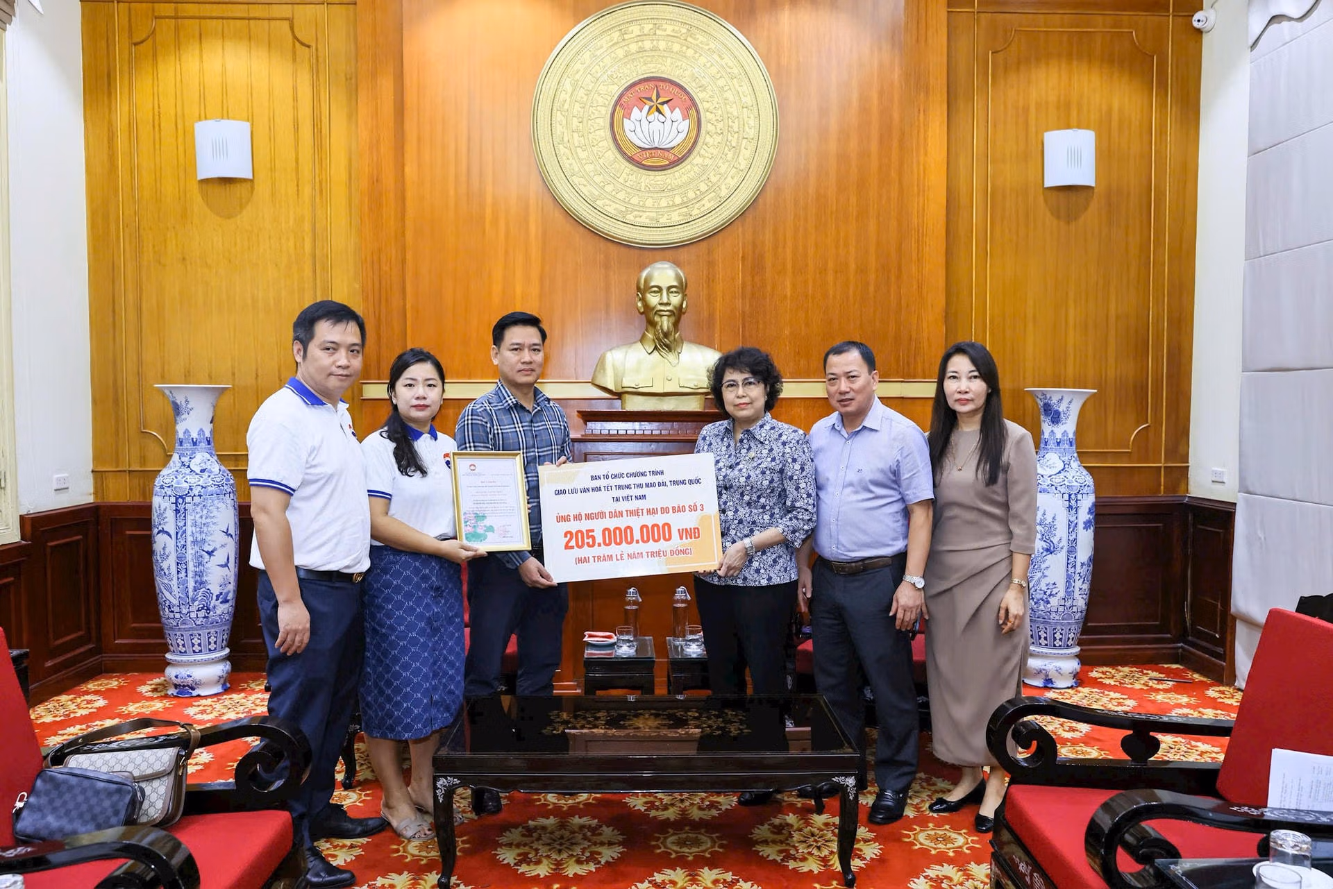 Thay mặt Ban Thường trực UBTƯ MTTQ Việt Nam, Phó Chủ tịch Tô Thị Bích Châu đã tiếp nhận 200 triệu đồng từ Tập đoàn hóa chất Việt Nam, Trường Đại học Công nghệ Giao thông Vận tải ủng hộ 500 triệu đồng; Công ty cổ phần liên doanh ô tô Hyundai Thành Công Việt Nam ủng hộ 1 tỷ đồng; Ban Tổ chức chương trình giao lưu văn hóa Tết Trung thu Mao Đài, Trung Quốc tại Việt Nam ủng hộ 205 triệu đồng; Tổng Công ty Thuốc lá Việt Nam trao hỗ trợ số tiền 6 tỷ đồng (Trong đó ủng hộ số tiền 1,5 tỷ đồng cho tỉnh Cao Bằng; 1,5 tỷ đồng cho tỉnh Phú Thọ; 1,5 tỷ đồng cho tỉnh Lào Cai; 1,5 tỷ đồng cho tỉnh Yên Bái);