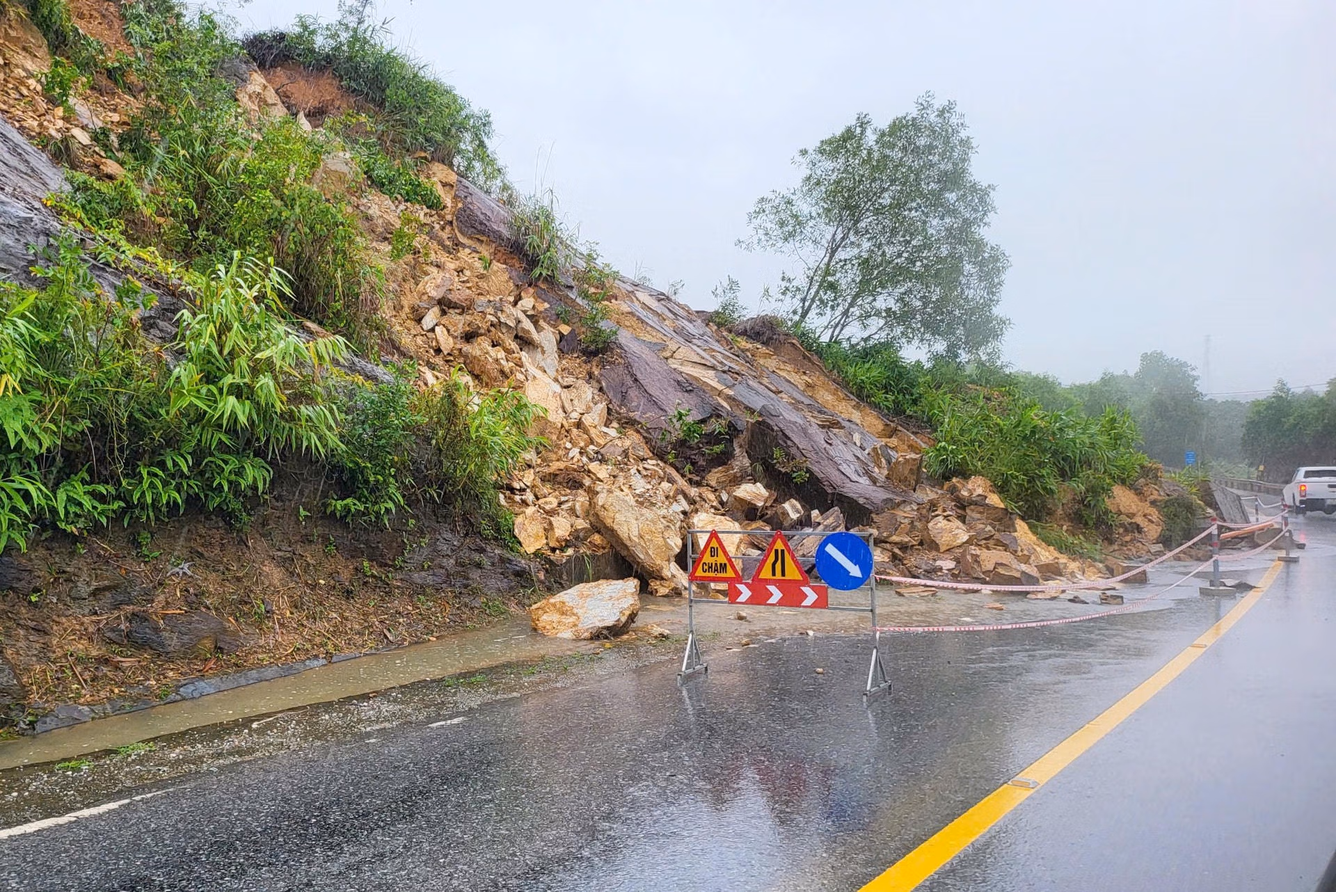 Các tuyến như Quốc lộ 9B, Quốc lộ 9C nước ngập sâu nhiều đoạn và đang tiếp tục lên gây tắc đường, đơn vị quản lý đã bố trí rào chắn và lực lượng trực gác cảnh báo.