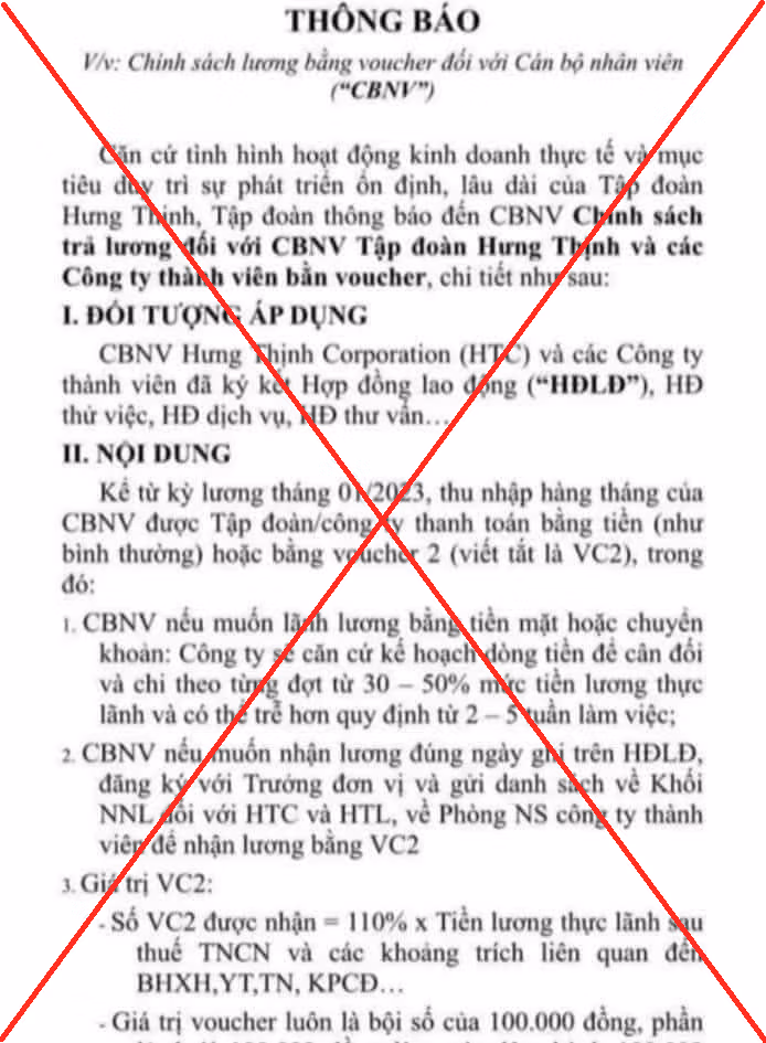 Một văn bản thông báo chính sách trả lương bằng voucher ghi là của Tập đoàn Hưng Thịnh đang lan truyền trên mạng. Tuy nhiên, phía Hưng Thịnh khẳng định là doanh nghiệp này không ban hành văn bản với nội dung trên.