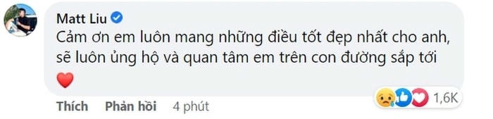 Sau khi Hương Giang lên tiếng xác nhận chia tay, chàng CEO Matt Liu cũng đã nhanh chóng để lại lời nhắn nhủ đến "người cũ" khiến nhiều người xúc động: "Cảm ơn em luôn mang những điều tốt đẹp nhất cho anh, sẽ luôn ủng hộ và quan tâm em trên con đường sắp tới".