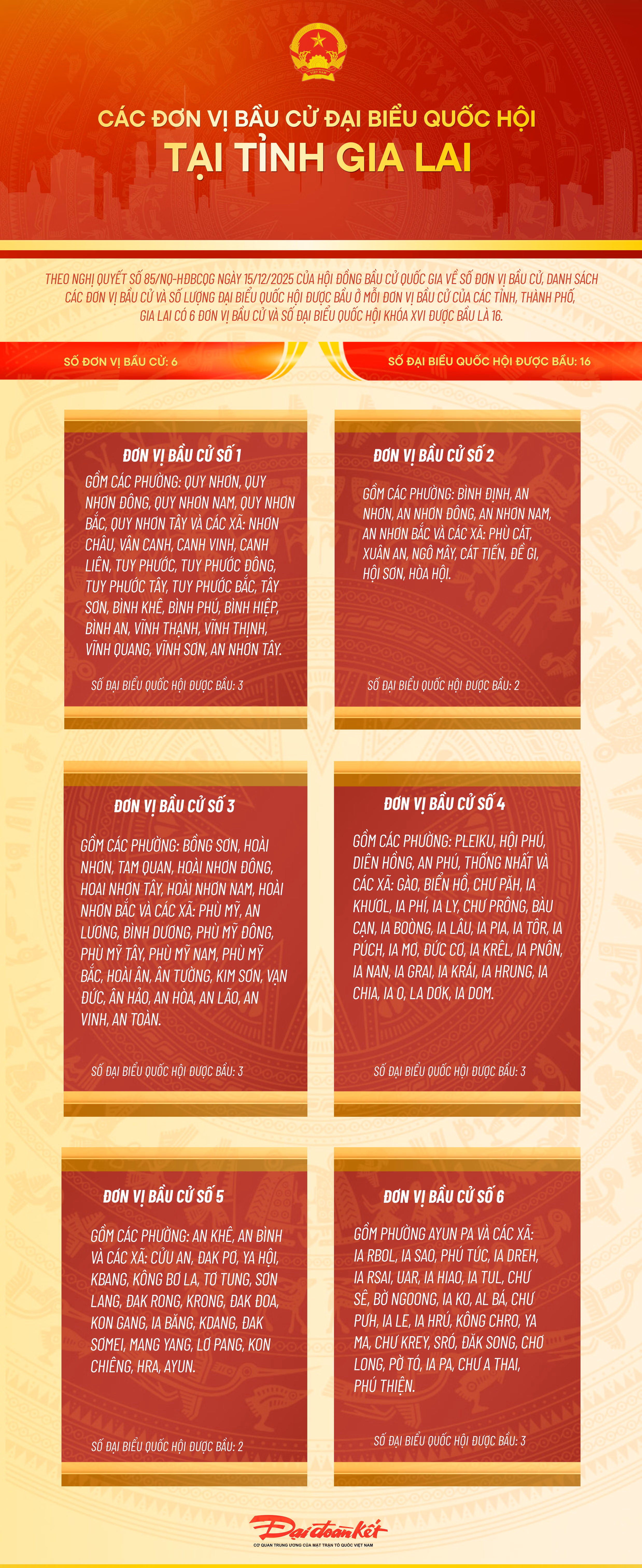 Theo Nghị quyết số 85/NQ-HĐBCQG ngày 15/12/2025 của Hội đồng Bầu cử quốc gia về số đơn vị bầu cử, danh sách các đơn vị bầu cử và số lượng đại biểu Quốc hội được bầu ở mỗi đơn vị bầu cử của các tỉnh, thành phố, Gia Lai có 6 đơn vị bầu cử và số đại biểu Quốc hội khóa XVI được bầu là 16.