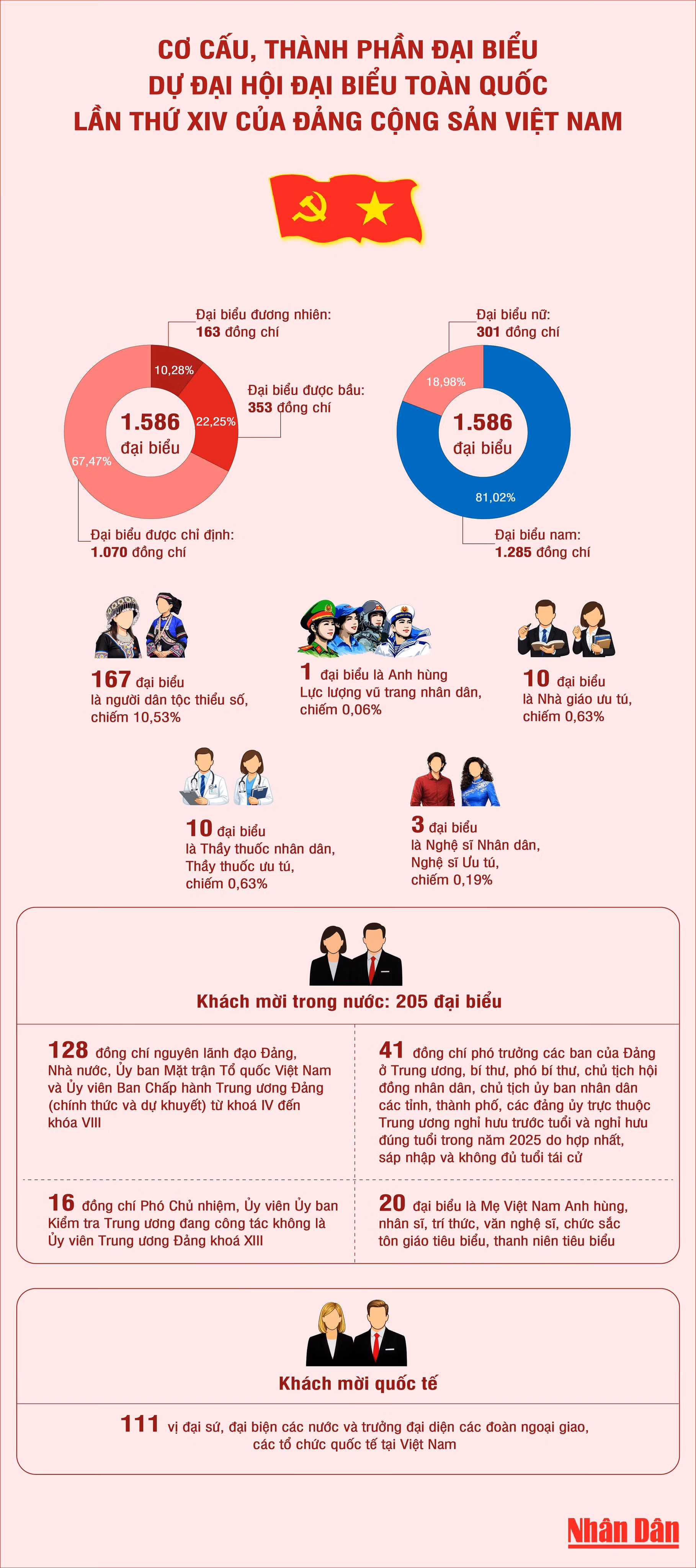Dự Đại hội đại biểu toàn quốc lần thứ XIV của Đảng Cộng sản Việt Nam có 1.586 đại biểu thay mặt cho hơn 5,6 triệu đảng viên toàn Đảng. Trong đó, đại biểu đương nhiên là 163 đồng chí, đại biểu được bầu là 353 đồng chí, đại biểu được chỉ định là 1.070 đồng chí.