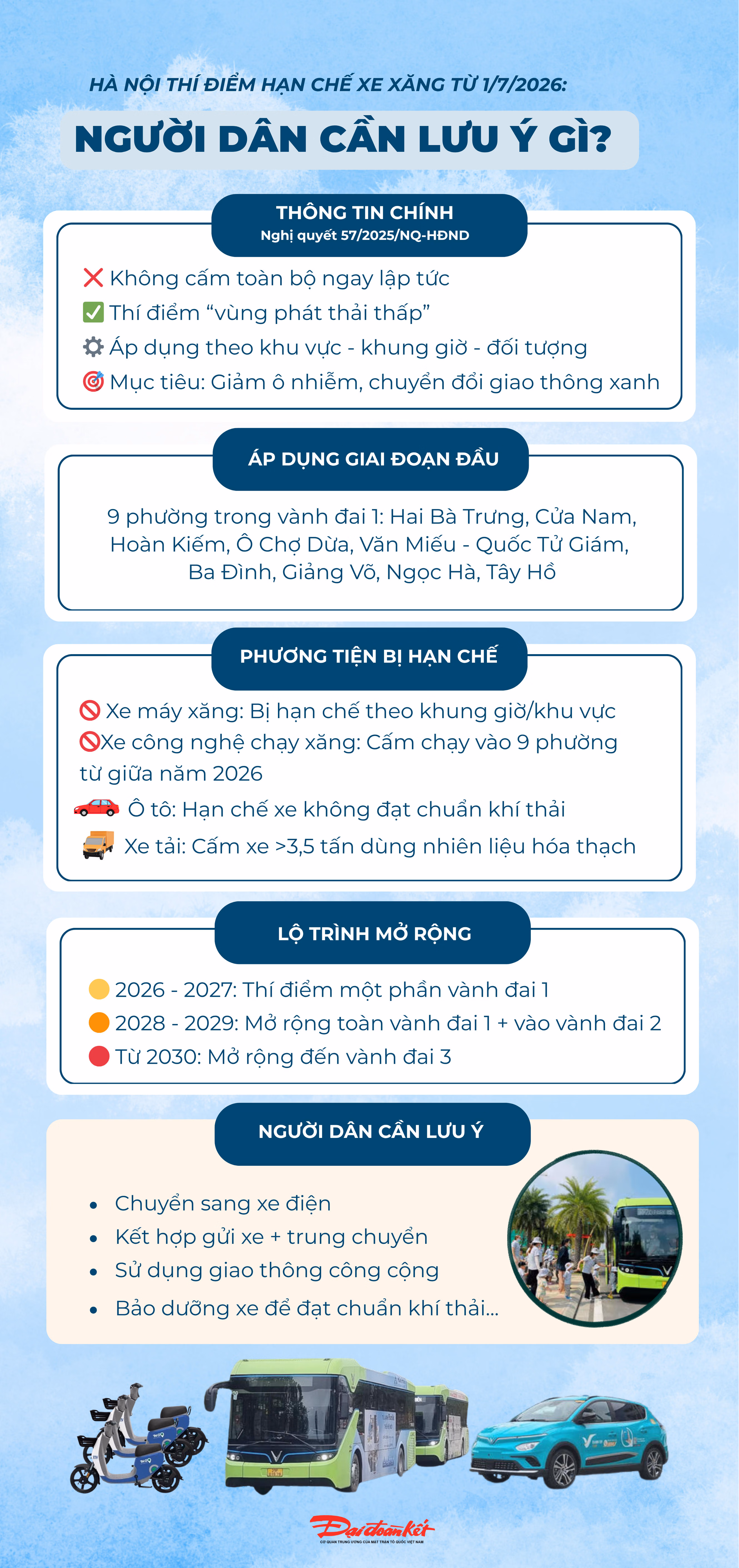 Theo Nghị quyết 57/2025/NQ-HĐND quy định thực hiện vùng phát thải thấp trên địa bàn thành phố, Hà Nội không triển khai vùng phát thải thấp đồng loạt trên toàn Vành đai 1 từ ngày 1/7, mà thí điểm theo vùng, có lộ trình, phạm vi, thời gian và đối tượng phù hợp.