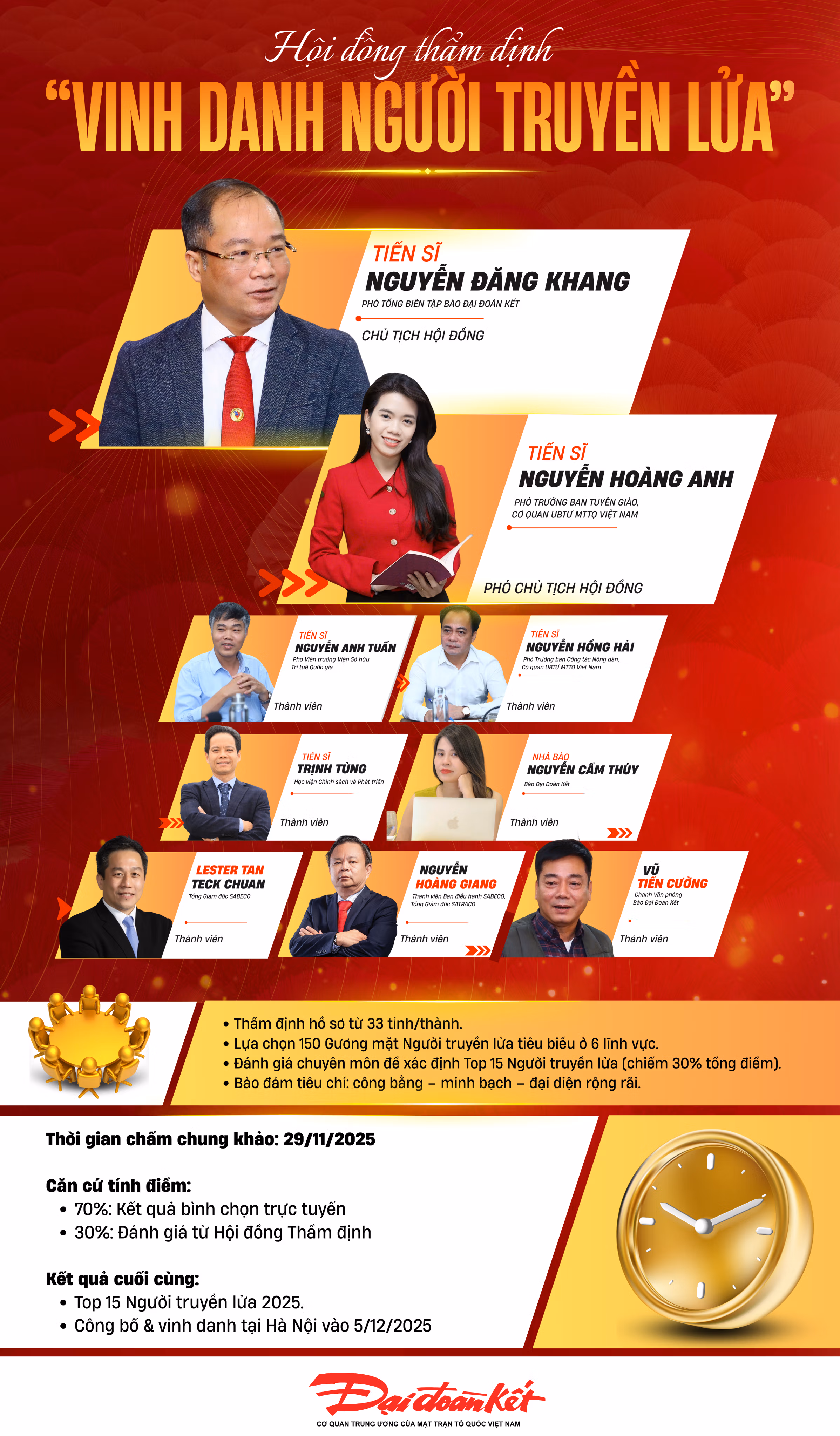 Đằng sau hành trình tôn vinh những "Người truyền lửa" là Hội đồng thẩm định – tập hợp các chuyên gia và đại diện cơ quan uy tín, đảm bảo mỗi gương mặt được lựa chọn đều phản ánh đúng giá trị nhân văn, tinh thần cống hiến và sức lan tỏa tích cực trong cộng đồng.
