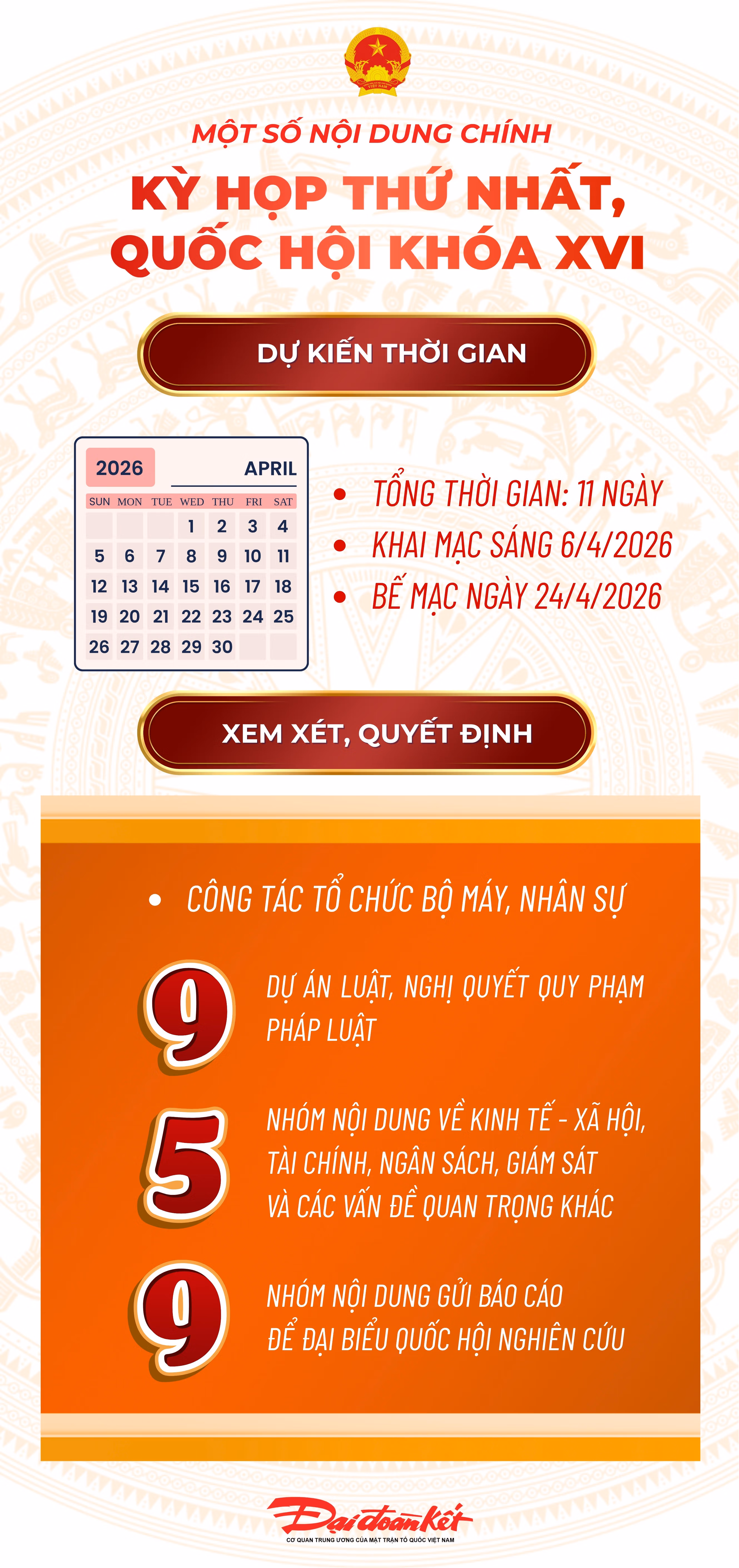 Quốc hội khóa XVI dự kiến tiến hành Kỳ họp thứ nhất với tổng thời gian làm việc 11 ngày, khai mạc vào sáng 6/4/2026, bế mạc ngày 24/4/2026. Kỳ họp này, Quốc hội sẽ xem xét công tác tổ chức bộ máy, nhân sự.