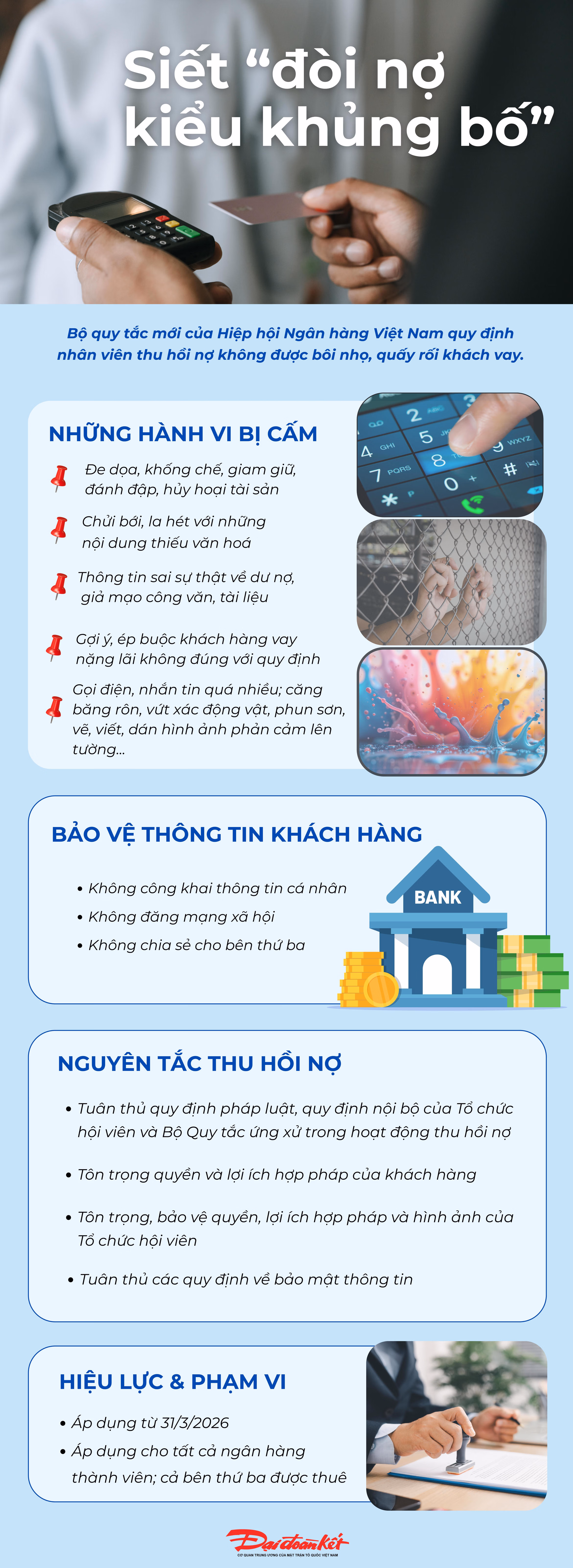 Hiệp hội Ngân hàng Việt Nam vừa ban hành Quyết định số 15 kèm theo Bộ Quy tắc ứng xử trong hoạt động thu hồi nợ. Đáng chú ý, quy tắc cấm nhân viên thu hồi nợ trực tiếp hoặc thông qua bên thứ ba dùng vũ lực, đe dọa, quấy rối, xúc phạm, lừa dối hoặc ép buộc khách hàng và người liên quan để thu hồi nợ.