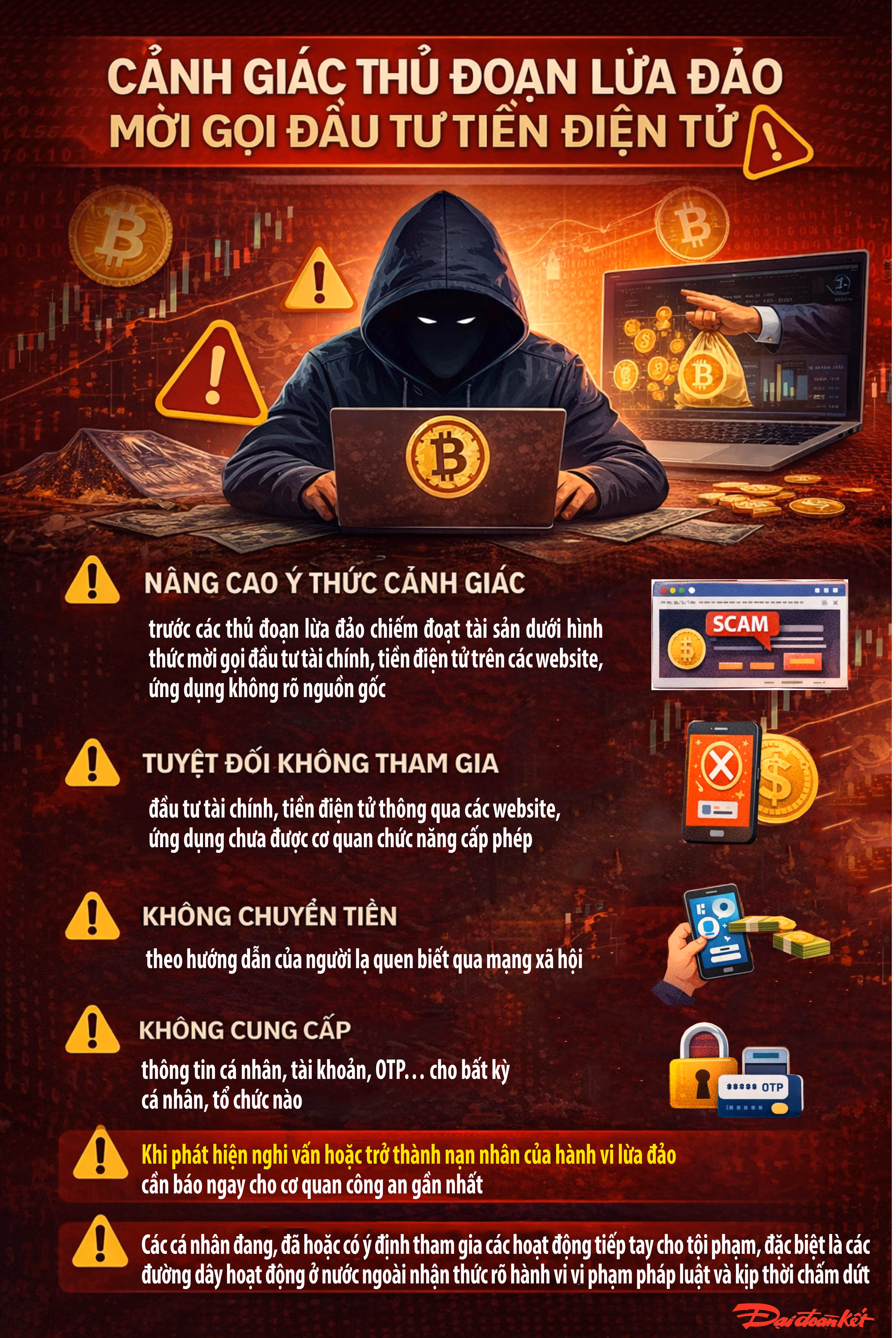 Cơ quan Công an khuyến cáo, người dân cần nâng cao ý thức cảnh giác trước các thủ đoạn lừa đảo chiếm đoạt tài sản dưới hình thức mời gọi đầu tư tài chính, tiền điện tử trên các website, ứng dụng không rõ nguồn gốc.