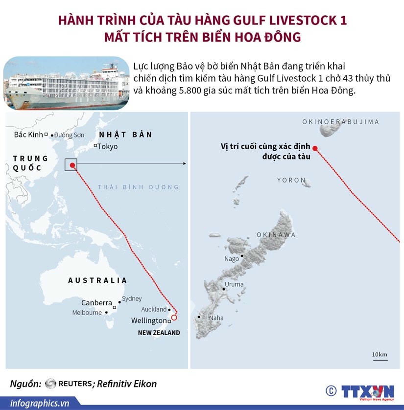 Lực lượng Bảo vệ bờ biển Nhật Bản đang triển khai chiến dịch tìm kiếm tàu hàng Gulf Livestock 1 chở 43 thủy thủ và khoảng gần 6.000 gia súc mất tích trên biển Hoa Đông.