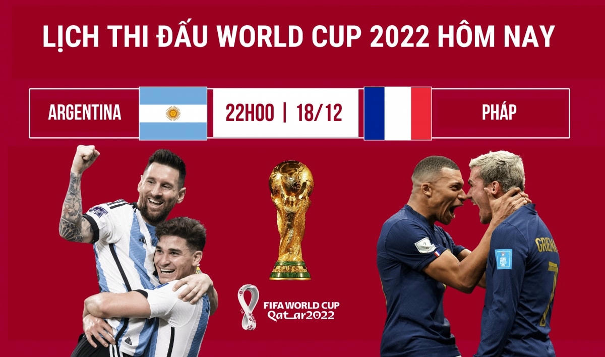 Theo VOV, hôm nay (18/12), World Cup 2022 sẽ đi tới hồi kết với cuộc thư hùng giữa Argentina và Pháp trên sân vận động Lusail. Theo lịch thi đấu World Cup 2022, trận chung kết Argentina vs Pháp sẽ diễn ra lúc 22h tối nay (giờ Việt Nam).