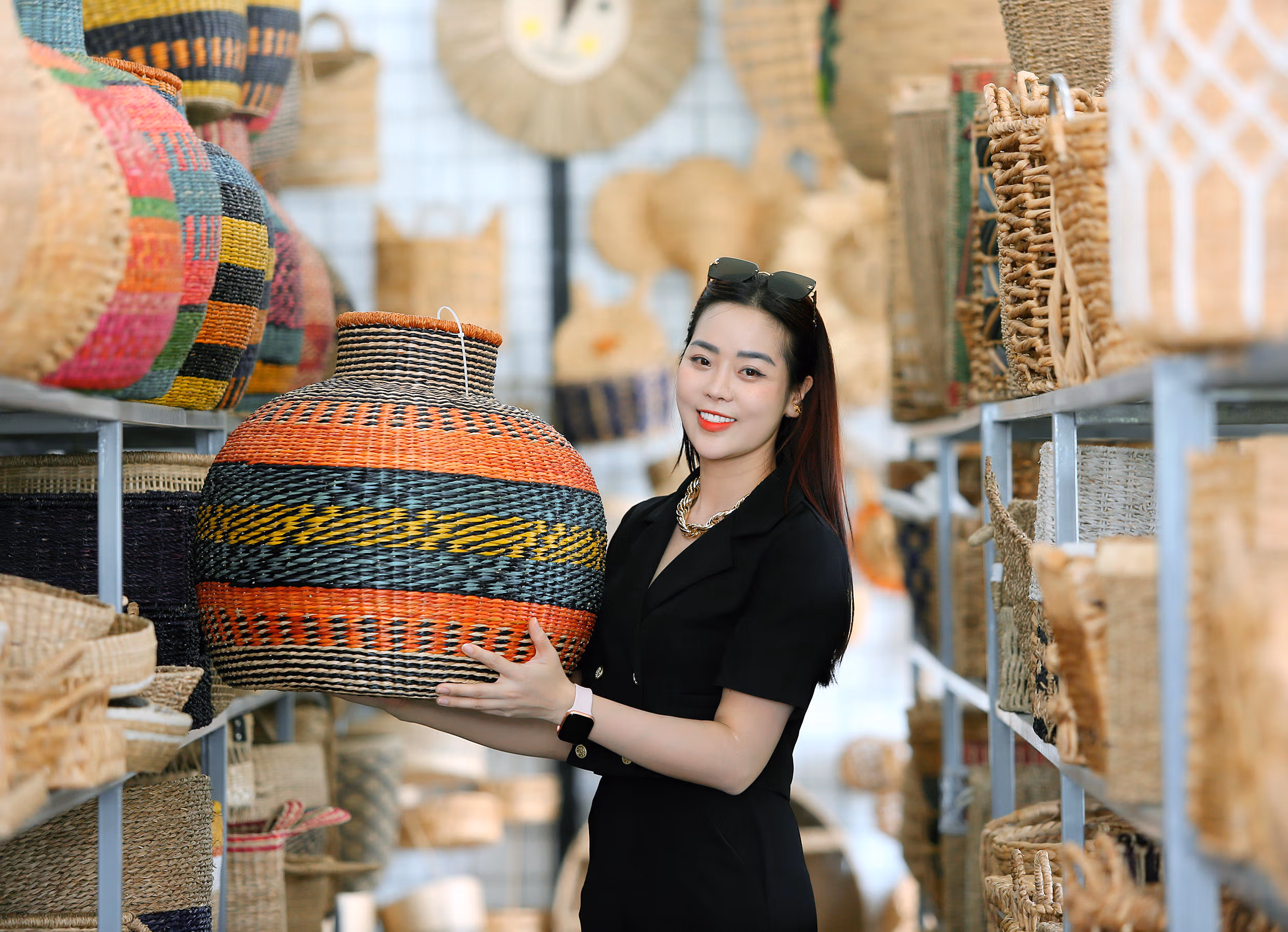 Trong những năm đứng lớp, chị nhận ra nhiều giá trị của nghề truyền thống đang dần mai một. Trăn trở ấy trở thành động lực khiến chị quyết định bắt đầu con đường thứ hai, đó là khởi nghiệp. Năm 2015, với số vốn ít ỏi, chị thuê một mặt bằng nhỏ để sản xuất, trưng bày sản phẩm thủ công. Đến năm 2018, chị mở rộng xưởng sản xuất, đầu tư máy móc, thiết bị hiện đại. Từ một cơ sở nhỏ, công ty Vina Handicrafts của 2 vợ chồng đã phát triển thành xưởng rộng 4.000 m2, với hơn 80 nhân công làm việc thường xuyên và gần 1.000 hộ dân gia công theo chuỗi. Các sản phẩm không chỉ còn là giỏ, làn truyền thống mà còn phong phú như thảm, đèn trang trí, khay, túi thời trang, đồ chơi trẻ em… làm từ cói, bèo tây, lục bình, thân thiện với môi trường.