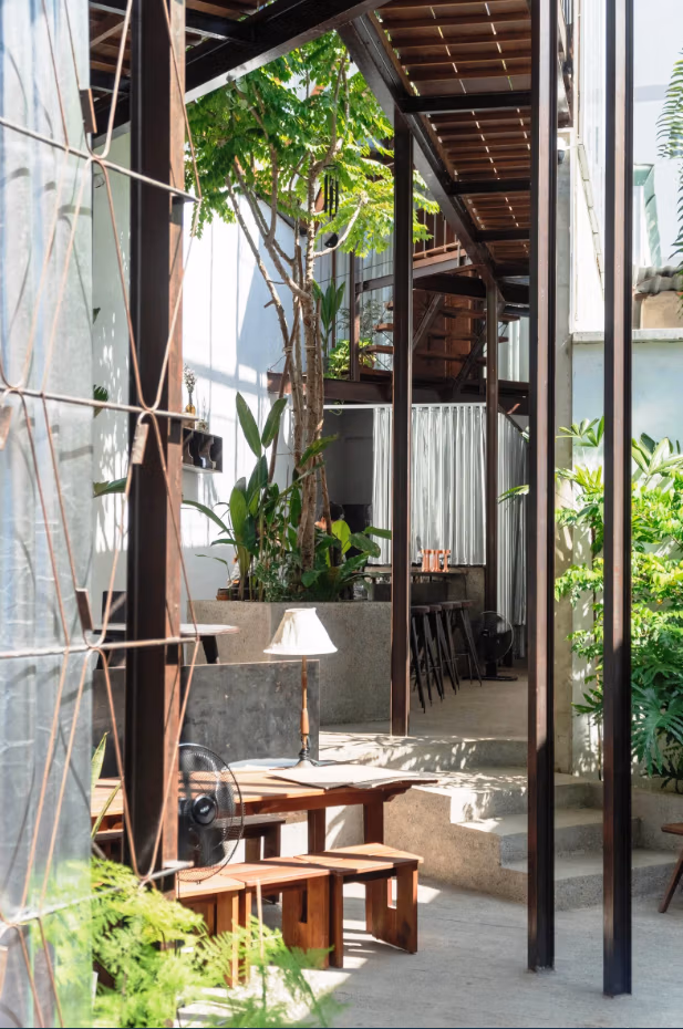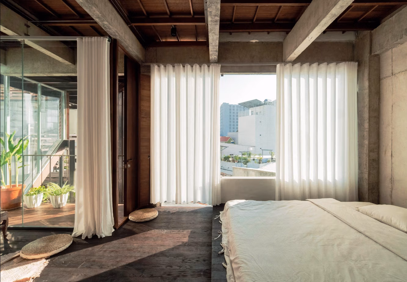 Khách sạn ở đường Dã Tượng, Nha Trang với mặt tiền tương đương một căn nhà ống được tạp chí Dezeen mô tả là “cấu trúc bê tông lộ thiên, mềm hóa bằng cây cối và đồ gỗ”.