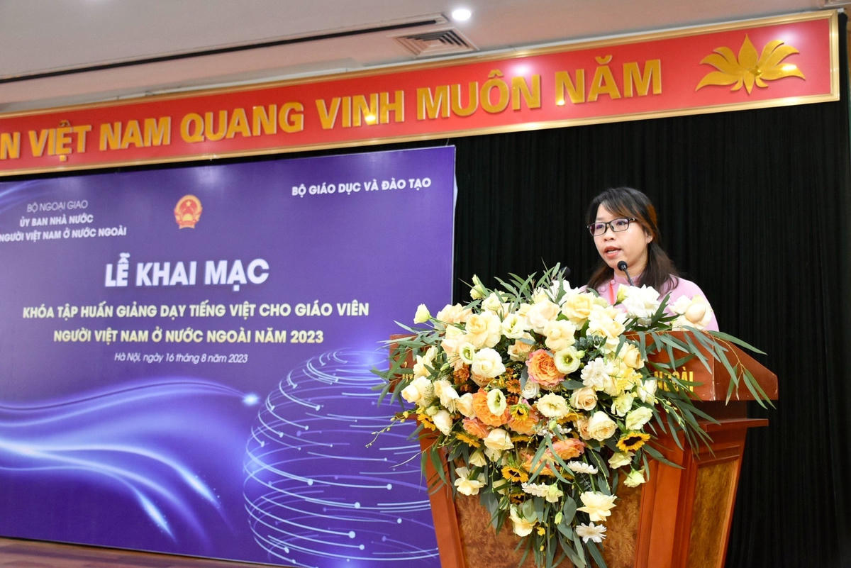 Phát biểu tại Lễ khai mạc, cô Nguyễn Thị Thu Huyền, giáo viên NVNONN trở về từ Lào, bày tỏ niềm vui và niềm vinh dự khi được tham gia Khóa tập huấn năm nay. Cô Huyền chia sẻ: “Đối với cộng đồng người Việt Nam đang sinh sống, làm việc ở nước ngoài, tiếng Việt là niềm tự hào dân tộc, là điểm tựa vững chắc cho văn hóa truyền thống” và “công cuộc truyền bá tiếng Việt cho các thế hệ NVNONN đã và đang gặt hái được nhiều thành tựu quan trọng”.