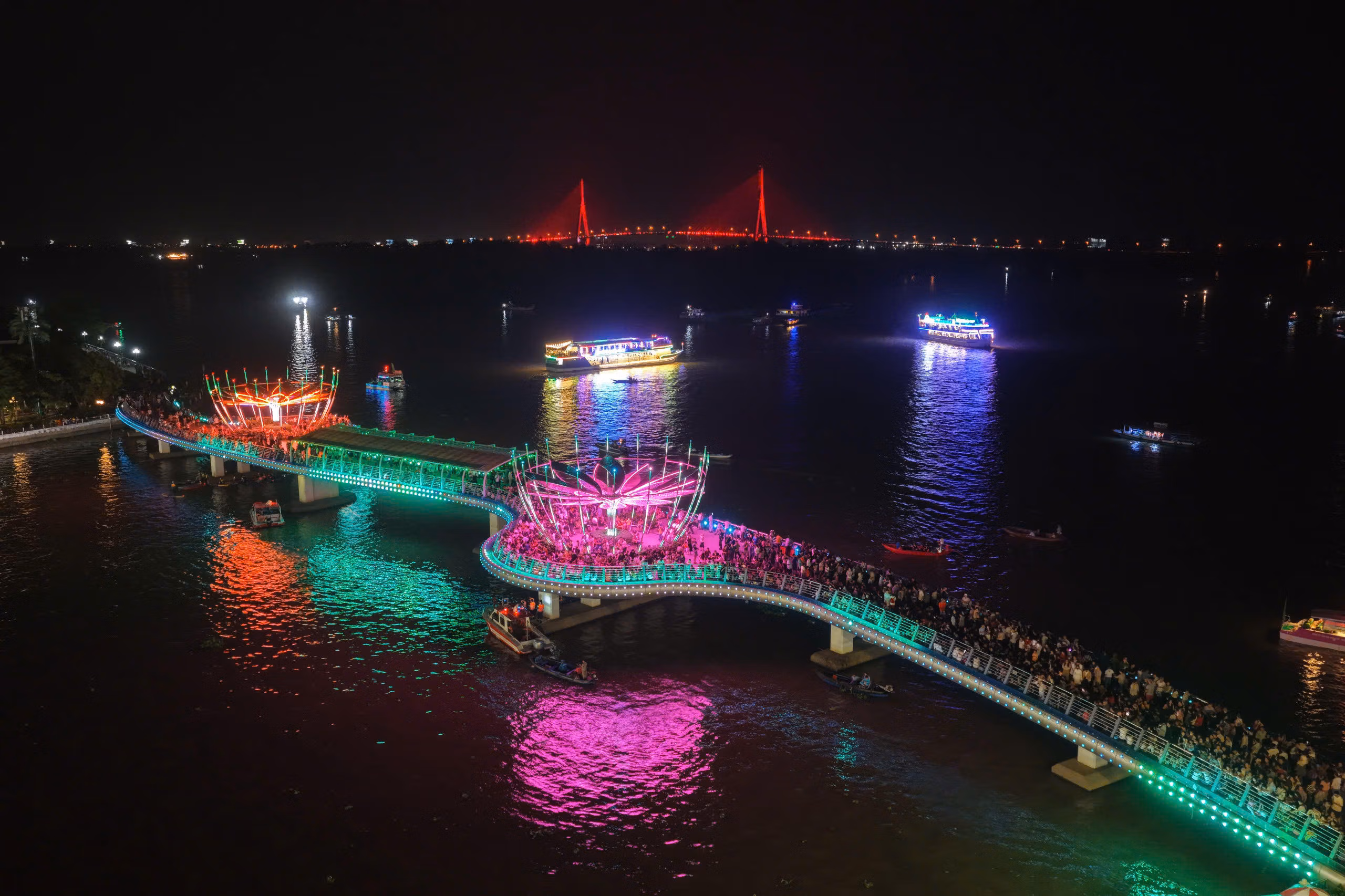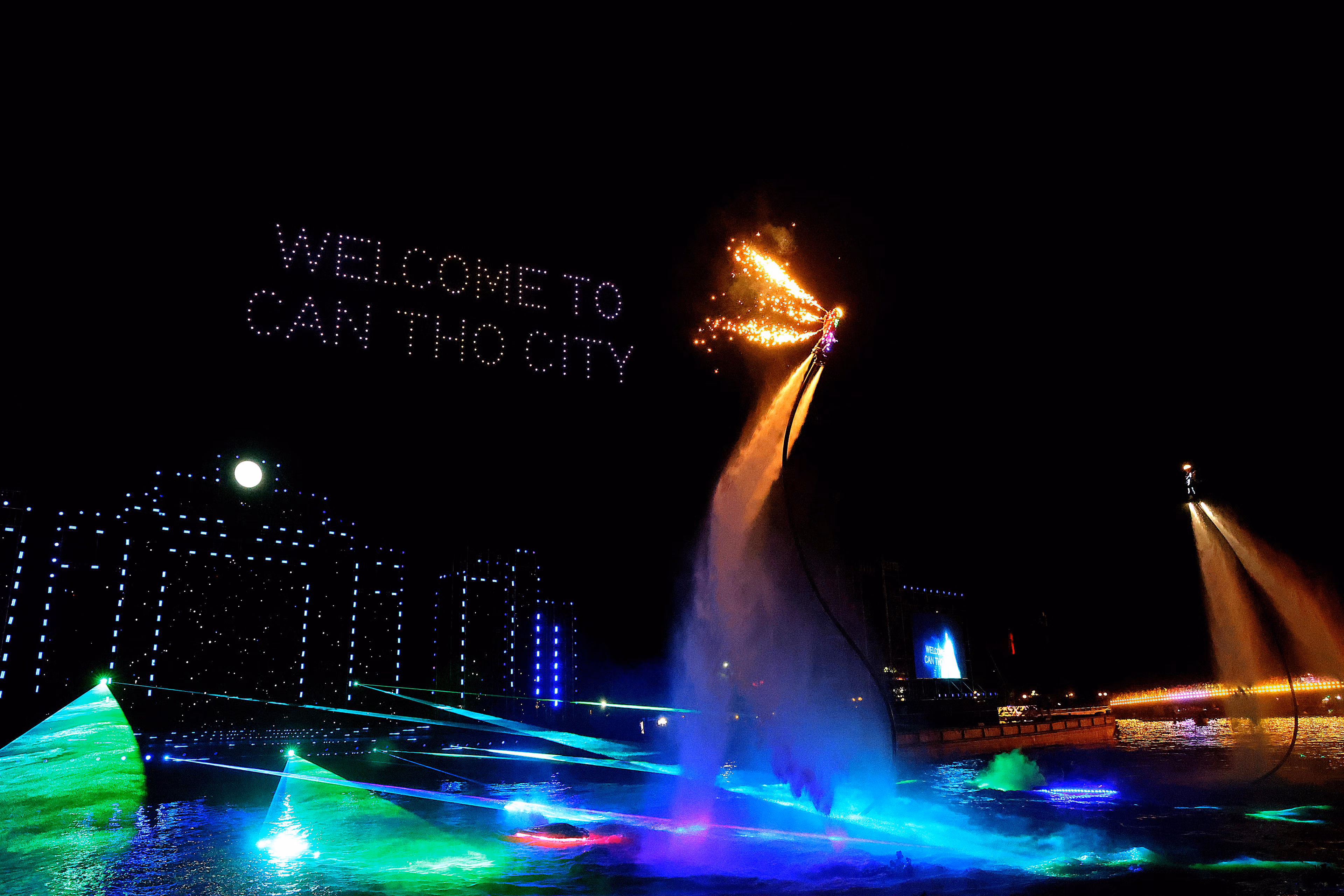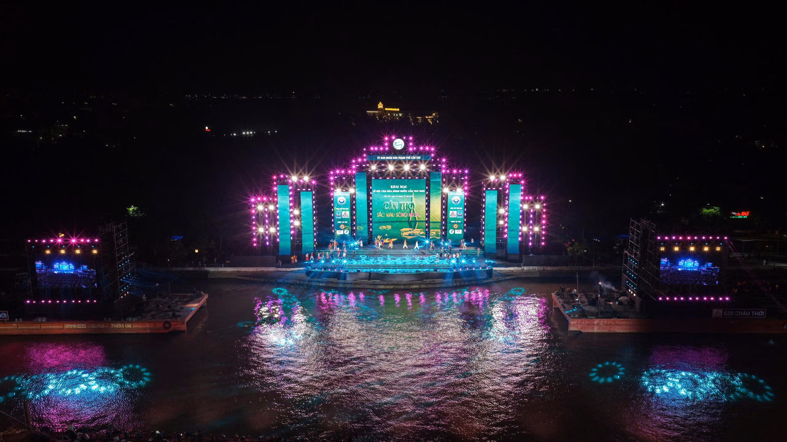 Điểm nhấn của chương trình ngoài tái hiện nét văn hóa sông nước, giới thiệu chợ nổi, rước dâu trên sông, đua ghe Ngo… còn là phần drone show và bắn pháo hoa nổ tầm thấp ấn tượng ngay khi chương trình nghệ thuật kết thúc.