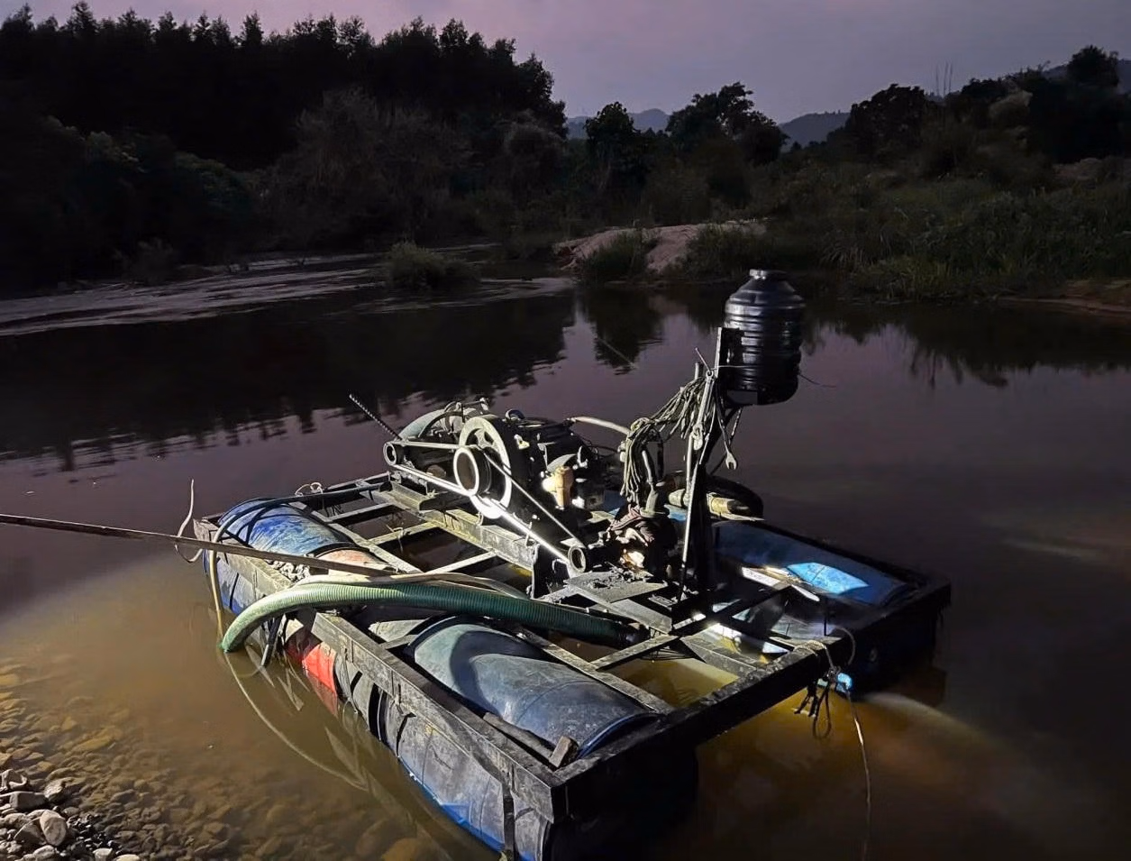 Trong quá trình tuần tra, kiểm soát lĩnh vực khoáng sản theo kế hoạch cao điểm, tối 11/4 Công an xã Trung Khánh Vĩnh, tỉnh Khánh Hòa, phát hiện một nhóm đối tượng đang sử dụng phà máy tự chế bơm hút cát trái phép tại khu vực sông Chò (thuộc thôn Ba Cẳng, xã Trung Khánh Vĩnh, tỉnh Khánh Hòa).