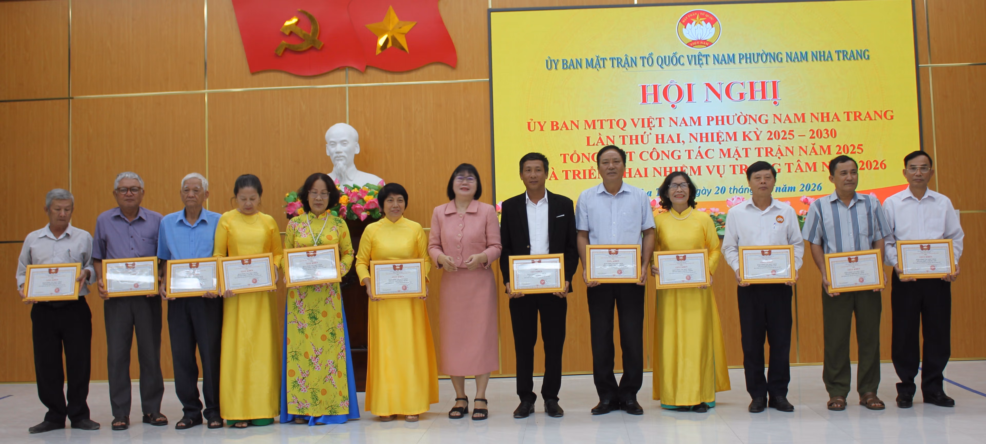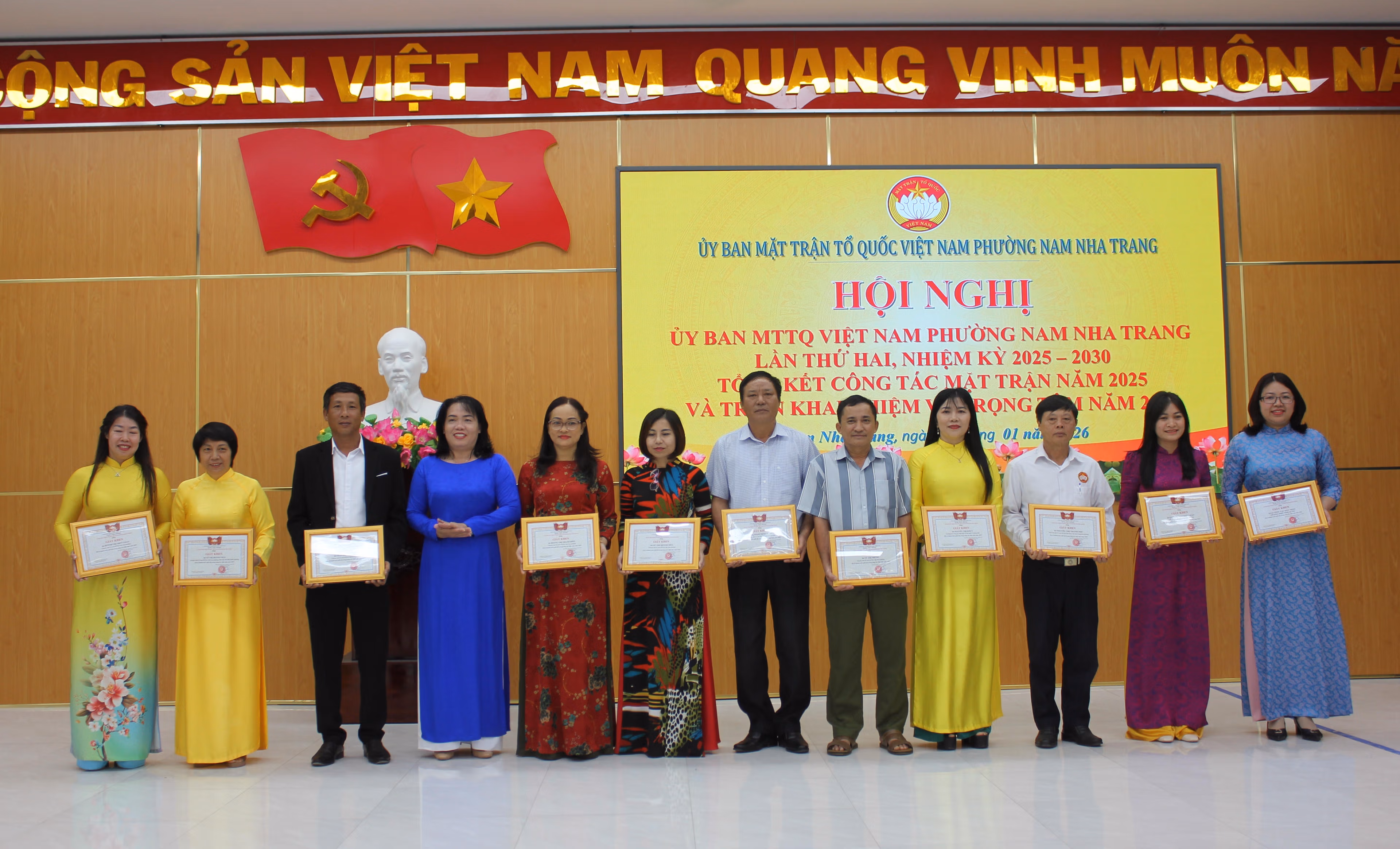 Nhân dịp này, Ủy ban MTTQ Việt Nam phường Nam Nha Trang tặng Giấy khen cho 13 tập thể và 23 cá nhân có thành tích xuất sắc năm 2025, tặng Giấy khen 22 cá nhân đã có thành tích tiêu biểu trong công tác mặt trận năm 2025.